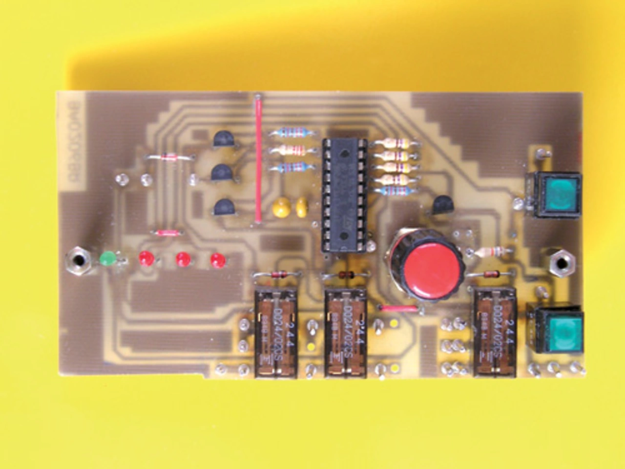 Die Milchpulverentnahme erfolgt über eine Förderschnecke im Vorratsbehälter, die durch einen Getriebemotor angetrieben wird. Dieser Getriebemotor wird vom Controller über ein Relais angesteuert. Die Wasserentnahme erfolgt durch ein handelsübliches Magnetventil, das vom Controller über einen Transistor angesteuert wird. Eine unter dem Milchfläschchen angebrachte Waage registriert die Füllmenge. Der Controller errechnet dann die zum eingefüllten Milchpulver zugehörige Wassermenge. Die komplette Steuereinheit inklusive Sollwertgeber, Controller und Relais ist auf einer kleinen Steuerplatine (Bild 5) untergebracht, die direkt hinter der Gehäusefront montiert wurde. Die physikalischen Signale für Temperatur und Gewicht werden durch eine separate Steuereinheit in eine Spannung zwischen 0 und 5 V gewandelt und so-mit für den Controller „lesbar“ gemacht.