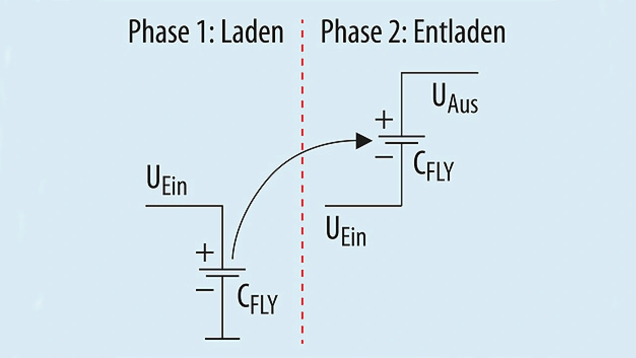 Der Boost- oder Aufwärts-Wandler ist der elementarste Ladungspumpen-Wandler, während der Ladungspumpen-Verdoppler die einfachste Boost-Konfiguration darstellt. Bei dieser Topologie wird der Schaltkondensator in der ersten Phase (Laden) zwischen Eingangsspannung und Masse aufgeladen und in der zweiten Phase (Entladen) zwischen Eingangsspannung und Ausgangsspannung geschaltet. Durch dieses Stacking erhält man eine Ausgangsspannung, die das Doppelte der Ausgangsspannung beträgt (Bild 3).