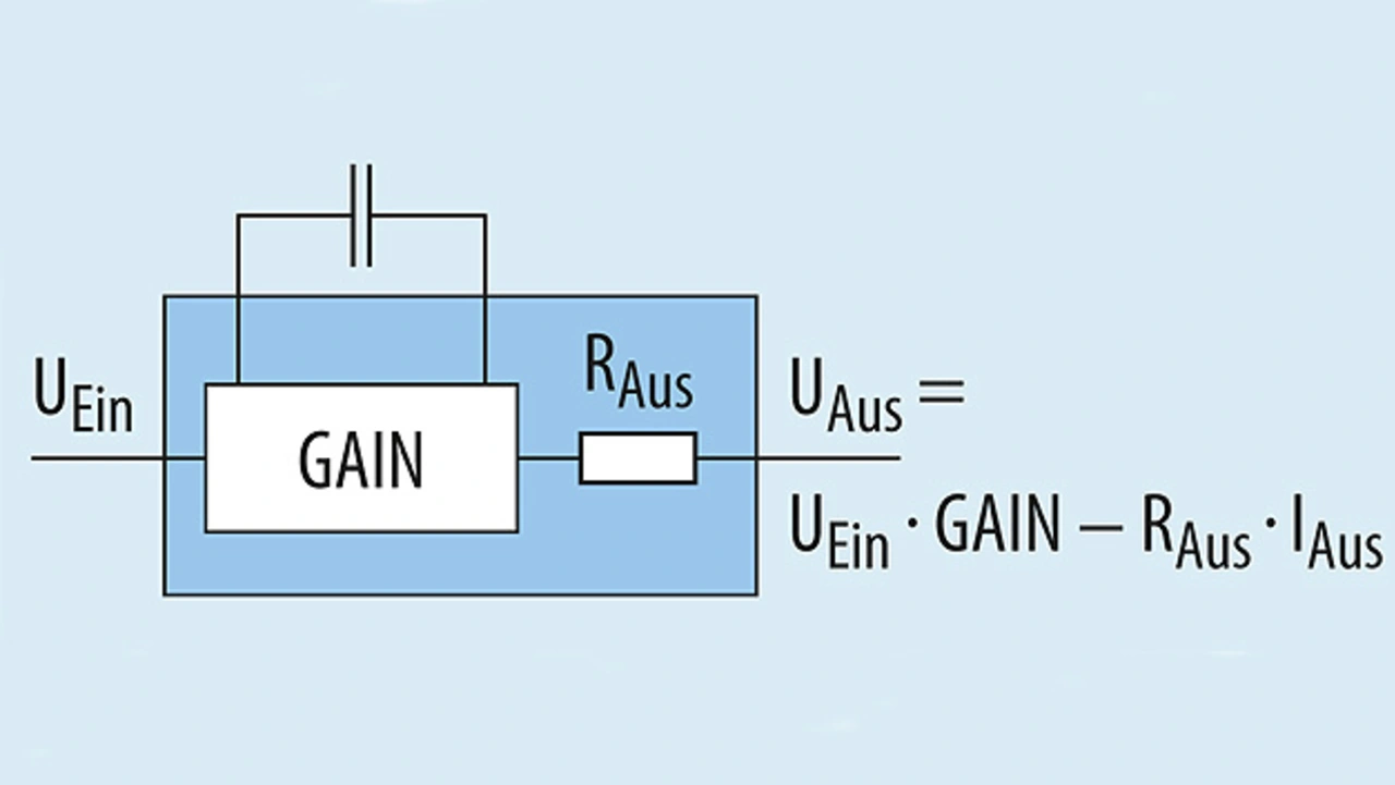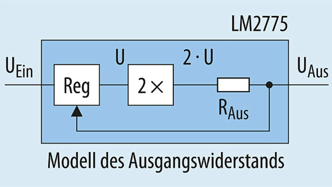 Im Fall des ungeregelten Spannungsverdopplers kann man sich die Schaltung als ideale Verstärkerstufe vorstellen, gefolgt von einem Serienwiderstand, der die Ausgangsimpedanz der Ladungspumpe (RAus) darstellt (Bild 4).