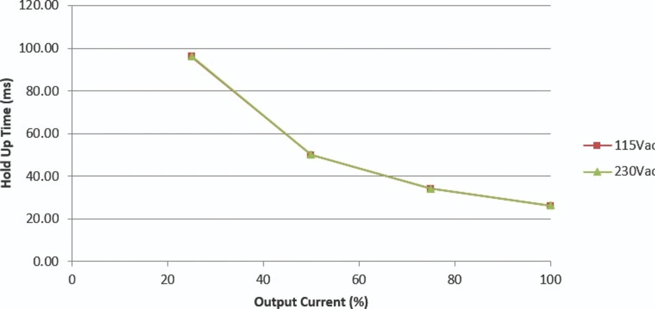 Bild 2 zeigt die detaillierten Informationen zur Überbrückungszeit im Evaluierungsbericht des CUS250M-12. Bei 100 Prozent Last beispielsweise hält der Ausgang des Netzteils etwa 28 ms lang durch, was dem Doppelten der publizierten Spezifikation entspricht. Dies gibt dem Benutzer ausreichend Sicherheit, dass die Stromversorgung auch nach jahrelanger Betriebsdauer nicht durch kurze Netzunterbrechungen beeinträchtigt wird.