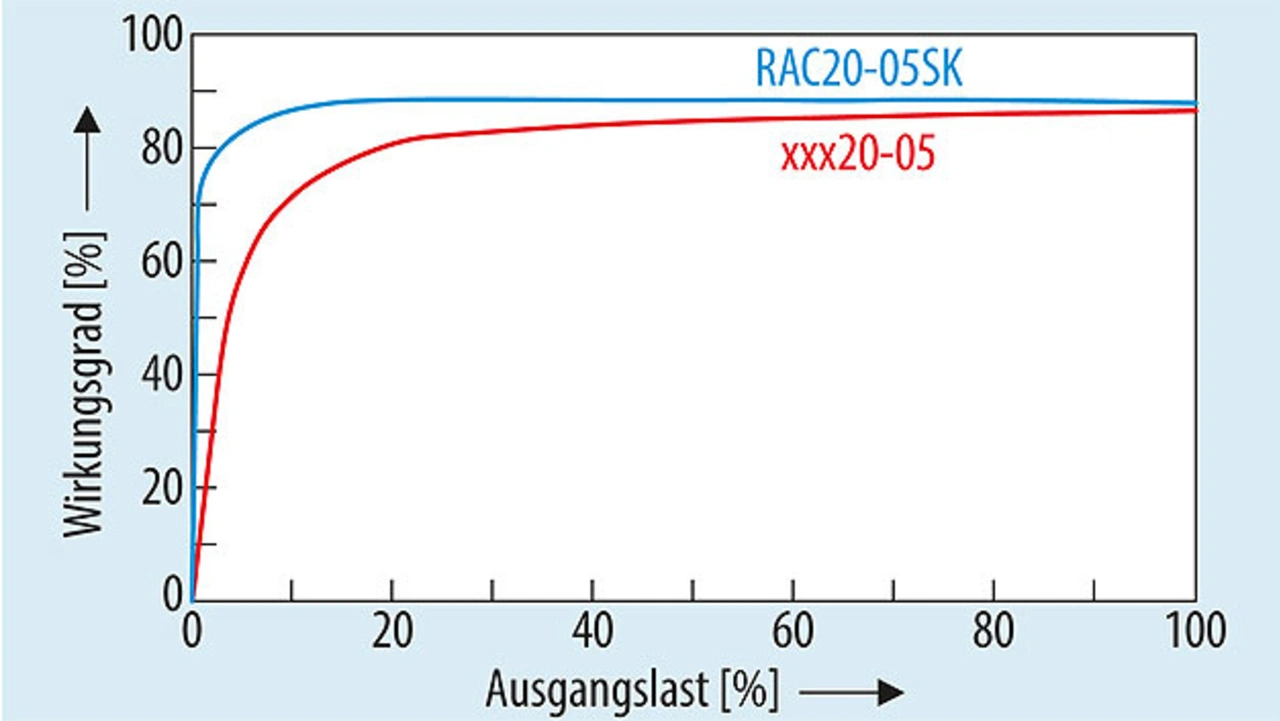 Selbst bei Lasten um 5 % werden noch Werte jenseits der 80-%-Marke erreicht. Vergleiche mit Wettbewerbsprodukten offenbaren markante Unterschiede. Während der RAC20-5SK bei 100 % Last nur wenig besser abschneidet als ein vergleichbares Produkt in herkömmlicher Technik, unterscheiden sich beide im unteren Bereich ganz gravierend.