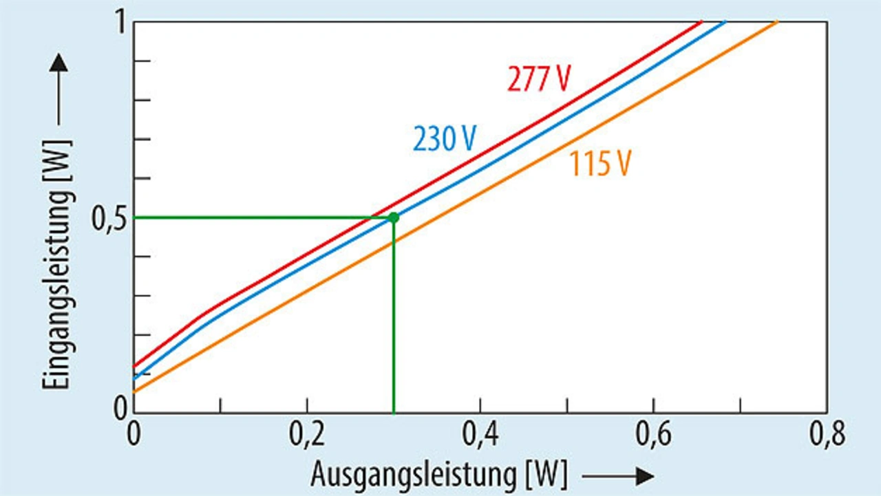 Wie eingangs erwähnt, dürfen entsprechend der seit 2013 gültigen ErP-Richtlinie einfache elektronische Geräte ohne Display im Standby-Modus maximal 0,5 W aufnehmen. Deshalb musste die Standby-Elektronik bislang mit eigenen kleinen Netzteilen versorgt werden. Erreichte ein 1-W-Modul bei halber Last noch 60 % Wirkungsgrad, waren am Ausgang effektiv 300 mW zur Versorgung der Standby-Elektronik verfügbar.
