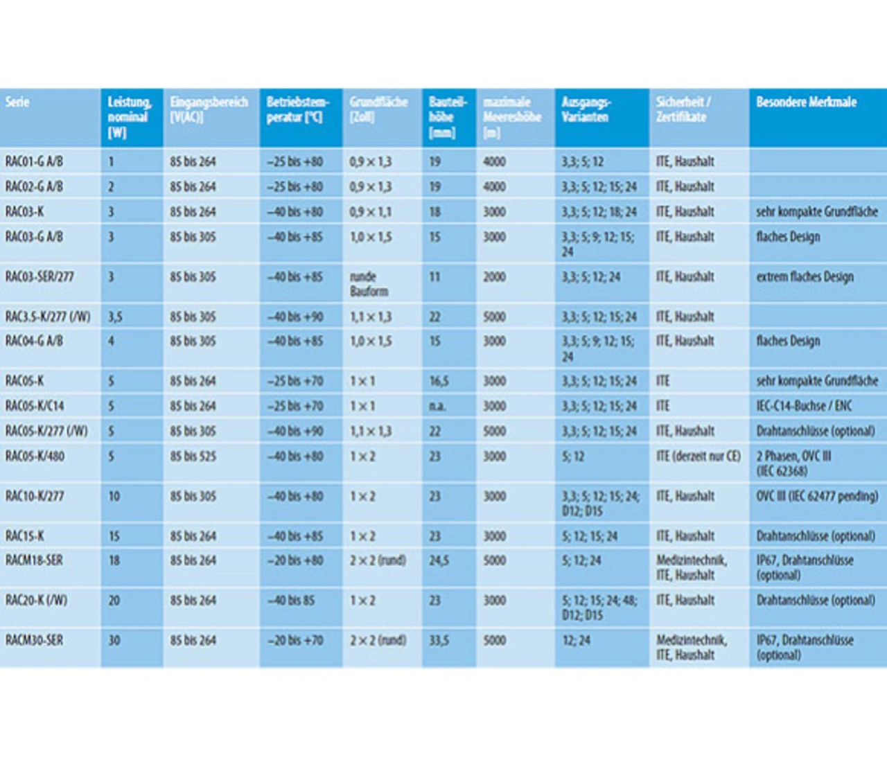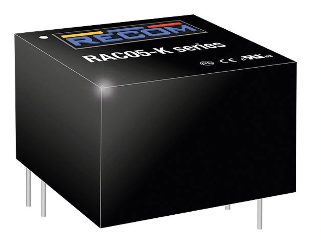 Bei der RAC05-K-Serie handelt es sich um ausgesprochen kompakte, vollständig gekapselte AC/DC-Module im Kunststoffgehäuse. Die Serie wird erstmals auf der Electronica 2018 gezeigt und dürfte weltweit das kleinste Modul sein, das »all inclusive« ohne externe Komponenten auskommt (Bild 7). Es entspricht allen wichtigen internationalen Normen wie der EN 60950-1, der UL 62368-1 sowie der EN 55032 Class B.