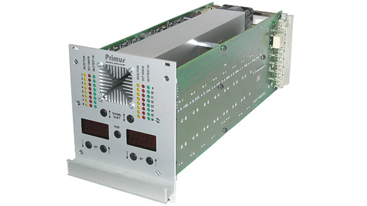 Der Kern der Testsysteme ist das rückspeisefähige Stromsenkenmodul CS960 mit 16 unabhängigen Eingangskanälen (Bild 1). Jeder Kanal stellt eine unabhängige elektronische Last mit einem im Bereich von 0 bis 5,0 A einstellbaren Sollstrom dar.
