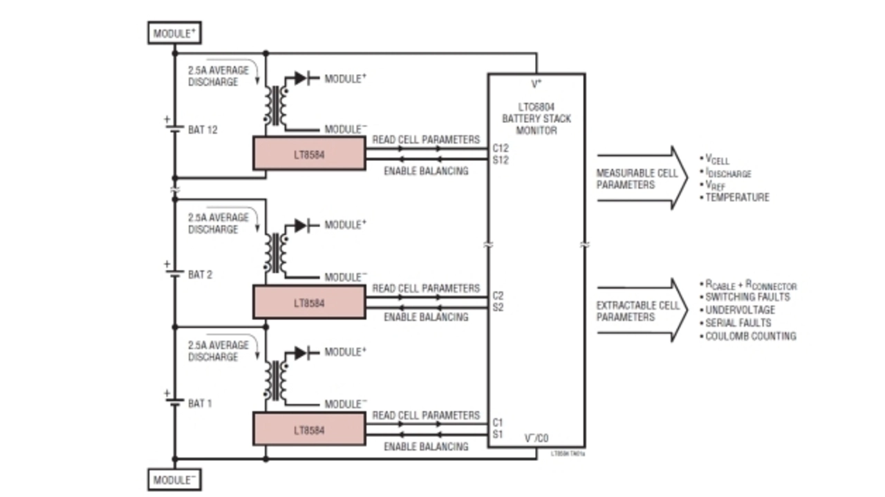 Der für das aktive "Load Balancing" erforderliche 6-A-MOSFET, der an 50 V betrieben werden kann, ist in den Baustein integriert. Dabei lässt sich durch das spezielle, galvanisch getrennte Design die Ladung von einer beliebigen Zelle des Akku-Stacks zu einer anderen Zelle übertragen; der mittlere Entladestrom beträgt dabei 2,5 A; die Ladung lässt sich aber auch einer externen 12-V-Batterie übertragen. Der Baustein bezieht seine Versorgungsenergie aus der Zelle, die er entlädt; damit entfallen komplizierte Vorspannungsschaltungen. Über den Anschluss "Enable" kann der LT8584 in Schaltungen mit der Zellenspannungsüberwachungs-ICs aus der Baureihe LTC680x. kombiniert werden. In Verbindung mit diesem Baustein lassen sich die Betriebsdaten der Spannungswandler an einen übergeordneten Mikroprozessor übertragen.