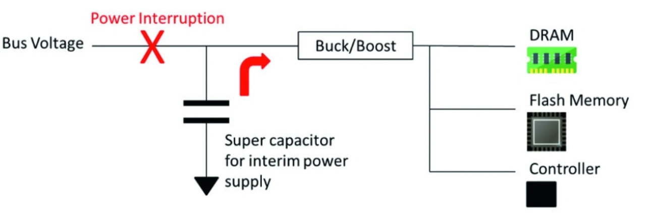Um dieses Problem zu eliminieren, wurden SSD-Karten im mittleren und oberen Preissegment mit einer Back-up-Stromversorgung ausgestattet, die für circa 10 ms die nötige Energie liefert, um die Daten sicher vom volatilen Cache-Speicher hin zum permanenten Flash-Speicher zu übertragen (Bild 1). Dieses Sicherungssystem ist weit verbreitet, insbesondere bei SSD-Karten für Firmen- oder Industrieapplikationen, in denen der Datenverlust geschäftskritisch sein könnte.