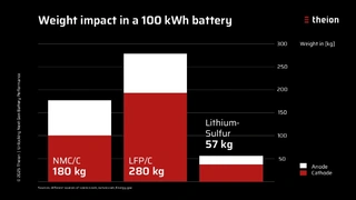 Batterien auf Schwefelbasis machen kritische Rohstoffe wie Kobalt oder Nickel überflüssig. Dieser Ansatz hat aber noch weitere Vorteile: Aufgrund der höheren spezifischen Kapazität der verwendeten Materialien zielt theion auf eine Kosten- und Gewichtsreduzierung auf ein Drittel der heutigen Batterietechnologie. Die neuartige Batterietechnologie soll eine stark verbesserte Nachhaltigkeitsbilanz und niedrigere CO₂-Emissionen gewährleisten. In der Bilderstrecke finden sich Vergleichsdaten zwischen Schwefel-Batterien zu bisherigen Lösungen.