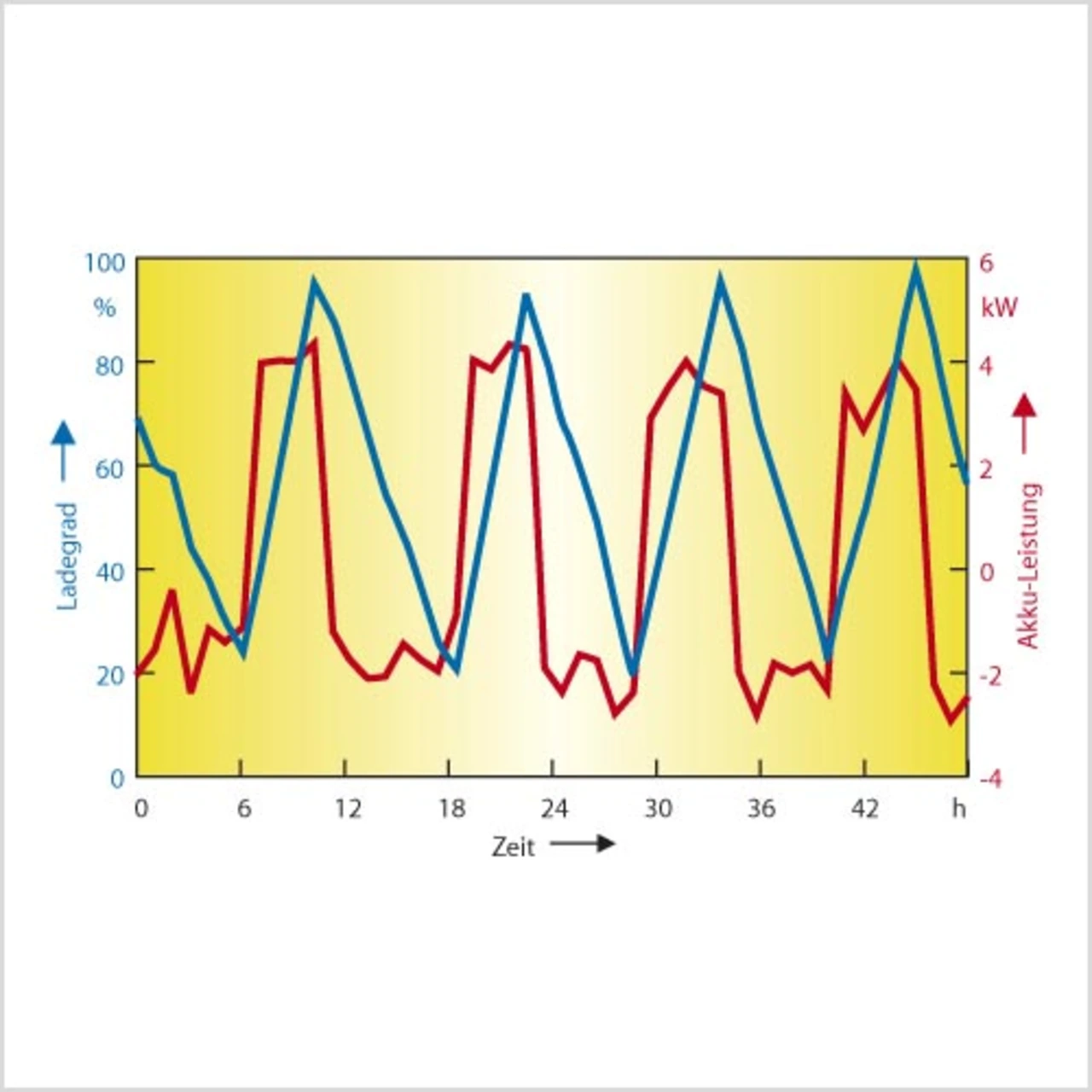 Bild 3 zeigt den Ladezustand einer Vanadium-Redox-Batterie (5 kW, 20 kWh) mit einem 6-kW-Dieselgenerator in einer Simulation mit einer nicht konstanten Last von etwa 40 kWh/ Tag und 3,5 kW Spitzenleistung. Der Akku durchläuft dabei periodische Zyklen mit tiefer Entladung – ca. zwei volle Zyklen/Tag. Der Dieselgenerator läuft stets im optimalen Arbeitspunkt mit maximalem Wirkungsgrad, aber nur zu 40 % der gesamten Zeit. 60 % der Zeit ist er ausgeschaltet. Dies ist eine typische Betriebsart, bei der die Vanadium-Redox-Batterie eine längere Lebensdauer als ein Bleisäure-Akku aufweist. Eine größere Menge Elektrolyt – mehr Energie – würde die Frequenz der Dieselstarts noch weiter reduzieren, hätte aber keinen Einfluss auf die prozentuelle Laufzeit.