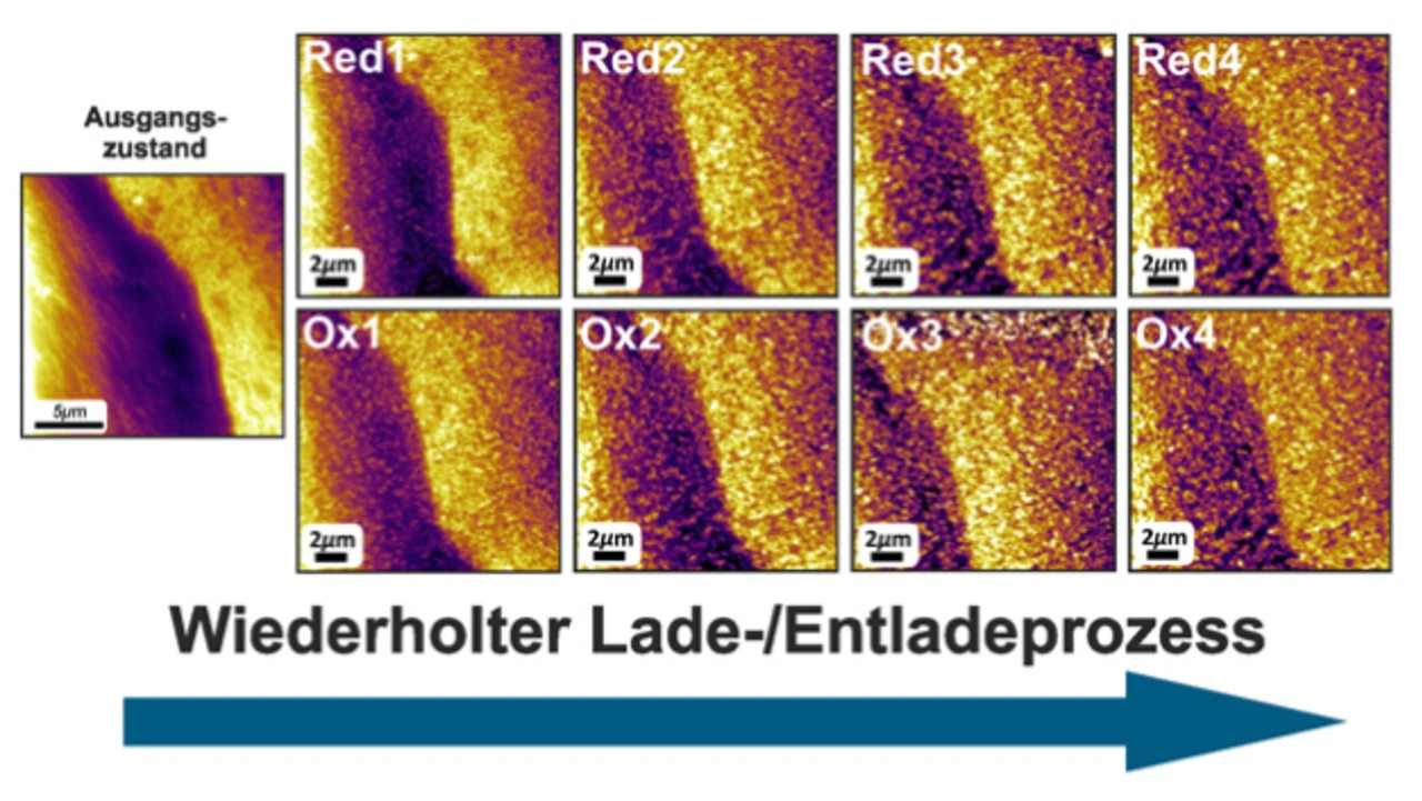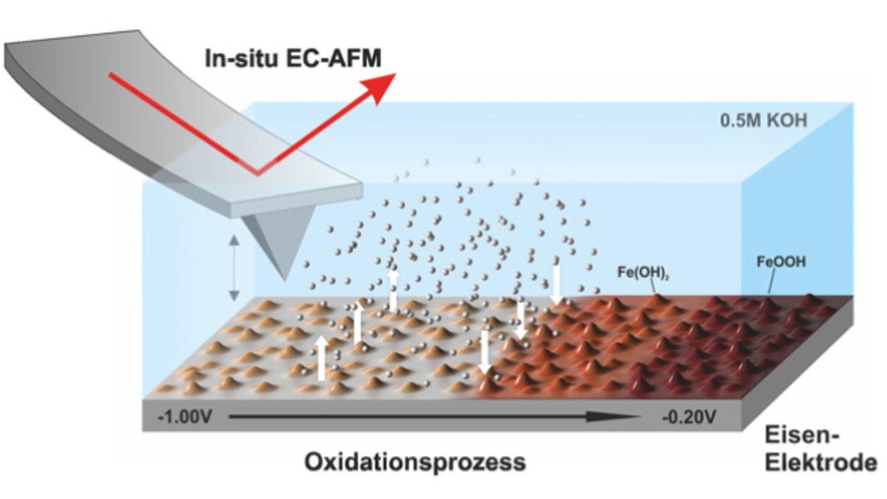 Die nun gewonnenen Erkenntnisse der Jülicher Forscher schaffen eine neue Basis, um die Eigenschaften der Batterie gezielt zu verbessern. Mittels sogenannter elektrochemischer In-Situ-Rasterkraftmikroskopie am Center for Nanophase Materials Sciences des US-amerikanischen Oak Ridge National Laboratory konnten sie mit Nanometerpräzision beobachten, wie sich Ablagerungen aus Eisenhydroxid-Partikeln (Fe(OH)2) an der Eisenelektrode unter Bedingungen bilden, wie sie auch beim Laden und Entladen der Batterie vorherrschen.