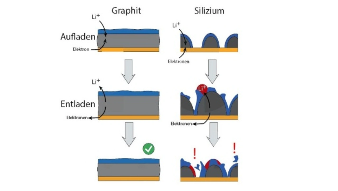 Auf Graphit ist diese Schicht – ähnlich einer Passivierungsschicht auf Edelstahl – nach wenigen Ladezyklen stabil und wächst nicht mehr weiter. Siliziumkörnchen jedoch vergrößern ihr Volumen drastisch, sodass diese dünne Grenzschicht immer wieder aufreißt. An den Rissen bildet sich jeweils eine neue Schicht. Damit wird bei jedem Ladezyklus ein bisschen Elektrolyt aufgebraucht, was die Zyklenfestigkeit des Akkus stark vermindert.