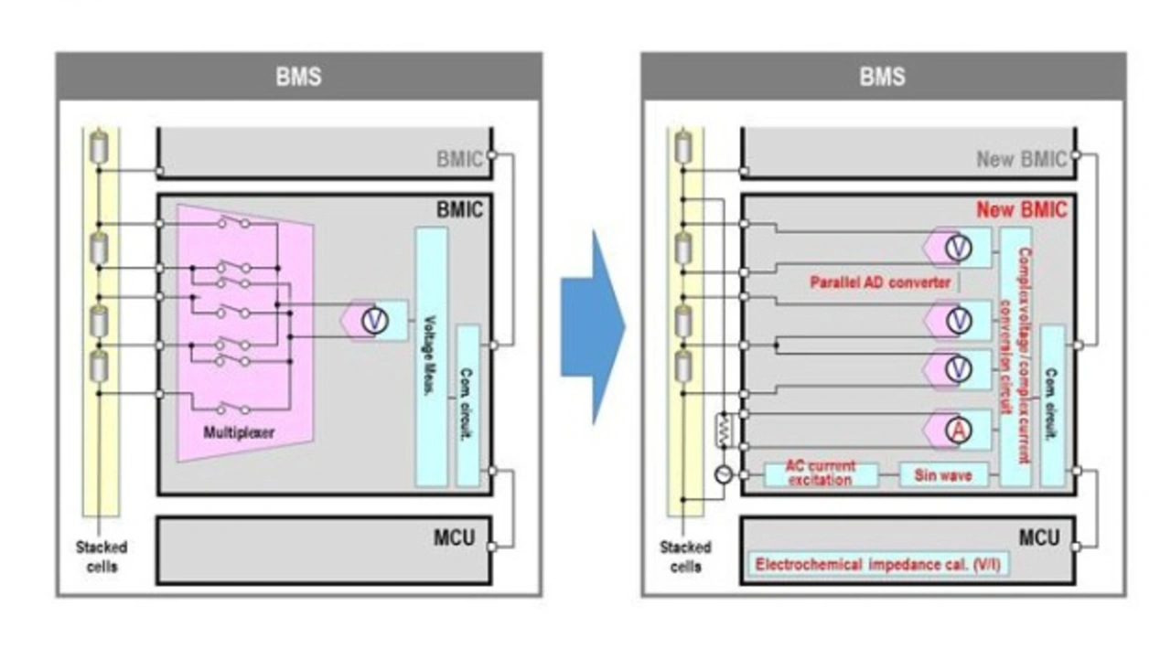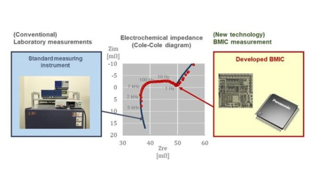 Der BMS-Testchip von Panasonic verfügt neben diesen konventionellen Funktionen auch über die Möglichkeit, die elektrochemische Impedanz nach dem Wechselstrom-Erregungsverfahren zu messen. Diese Messung erfolgt durch 15 komplett parallele A/D-Wandler und eine Erregerschaltung mit Impulsmodulation von 0,1 Hz bis 5 kHz sowie eine im Baustein integrierte Schaltung, mit der sich komplexe Spannungen und komplexe Ströme umrechnen lassen. Somit kann der BMS-Chip die elektrochemische Impedanz eines Akkus im Betrieb messen, ohne die Konfiguration des im Akku installierten aktuellen BMS signifikant verändern zu müssen.