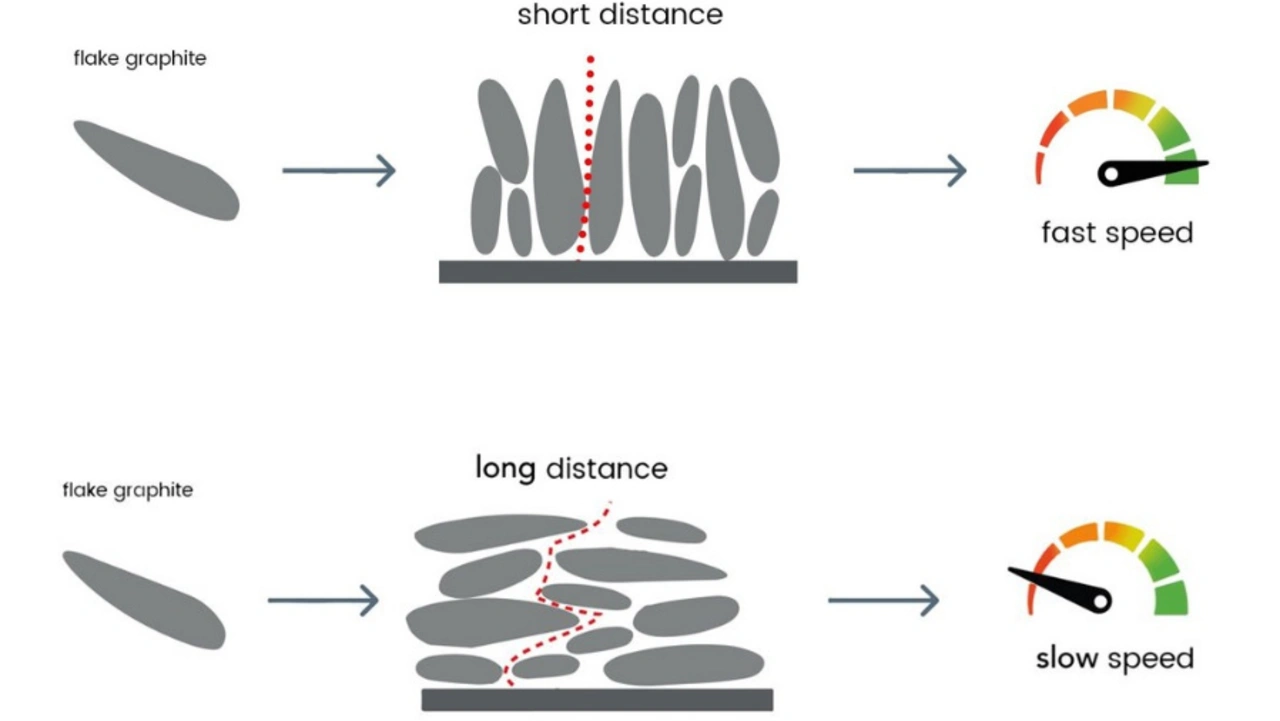 Bei der Aligned-Graphite-Technologie wird die Orientierung der Graphitflocken in der negativen Elektrode gesteuert. Durch sie vertikale Ausrichtung der Flocken sind die Transportwege für die Lithium-Ionen kurz. Dadurch sinkt der Zellenwiderstand, was zu höherer Leistung und geringerer Wärmeentwicklung führt. Außerdem lassen sich bei dieser Technologie kostengünstiger, weniger stark aufbereitete Graphitflocken einsetzen – ein umweltfreundlicher Ersatz, der den aufwendigen Prozessschritt der Graphitverrundung (Graphite Spheronization) vermeidet.