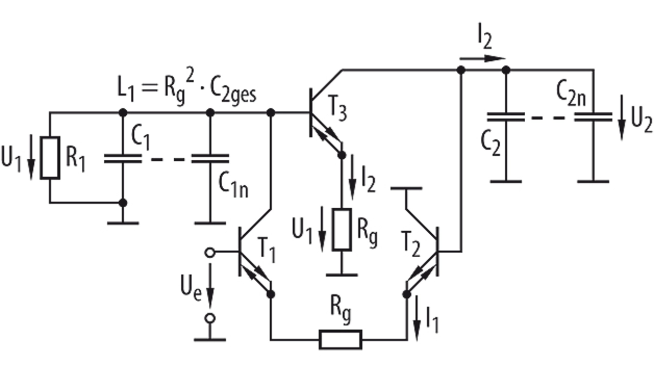Generell werden derartige Gyratoren auf der Basis von Operationsverstärkern realisiert. Mit einem Gyrator lassen sich verlustarme Induktivitäten erzeugen. Hierbei verhalten sich die beiden freien Anschlüsse des Gyrators so, als ob zwischen ihnen eine Induktivität L1 = Rg2 · C2 läge (Bild 2). Schaltet man zu der Induktivität L1 einen Kondensator C1 parallel, erhält man einen Parallelschwingkreis.