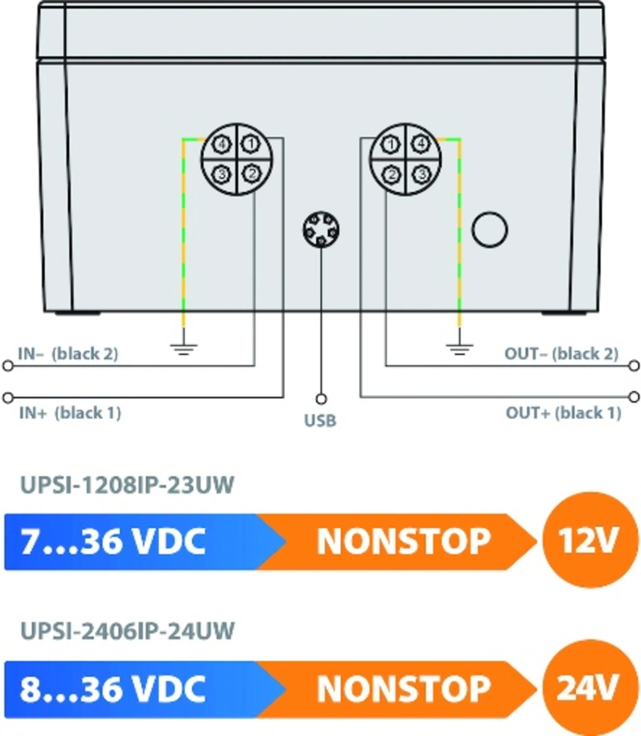 Eingangsseitig verfügen die beide DC-USV-Systeme über einen hocheffizienten DC/DC-Wandler mit Ultra-Weitbereichseingang von 7 bis 36 V DC (UPSI-1208IP-23UW) oder von 8 bis 36 V DC (UPSI-2406IP-24UW). Zur Unterdrückung netzseitiger elektromagnetischer Störungen ist dem Wandler ein EMV-Filter-Modul vorgeschaltet.