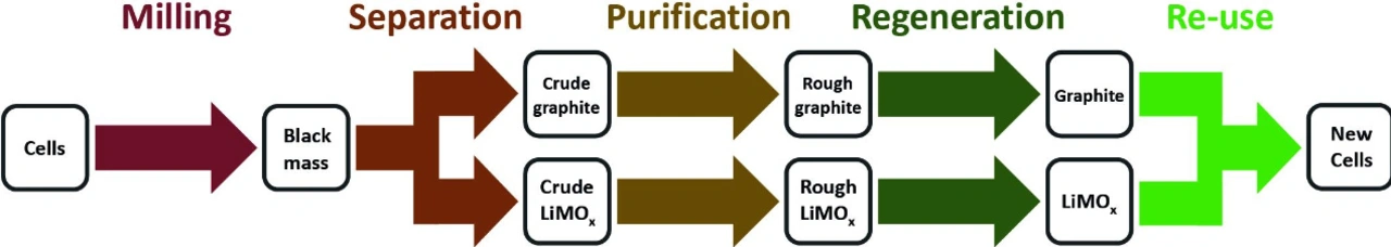 Moderne Batterien für Elektroautos enthalten in der Kathode häufig hohe Anteile des Übergangsmetalloxids NCM (Nickel, Kobalt und Mangan). Dessen Recycling aus Produktionsausschuss oder aus alten Batterien konzentrieren sich kommerzielle Wiederaufbereiter aktuell entweder auf das Schmelzen bei hohen Temperaturen (Pyrometallurgie) oder auf die chemische Auflösung (Hydrometallurgie) des sorgfältig entwickelten Kathodenmaterials und gewinnen damit nur die einzelnen Metalle zurück.