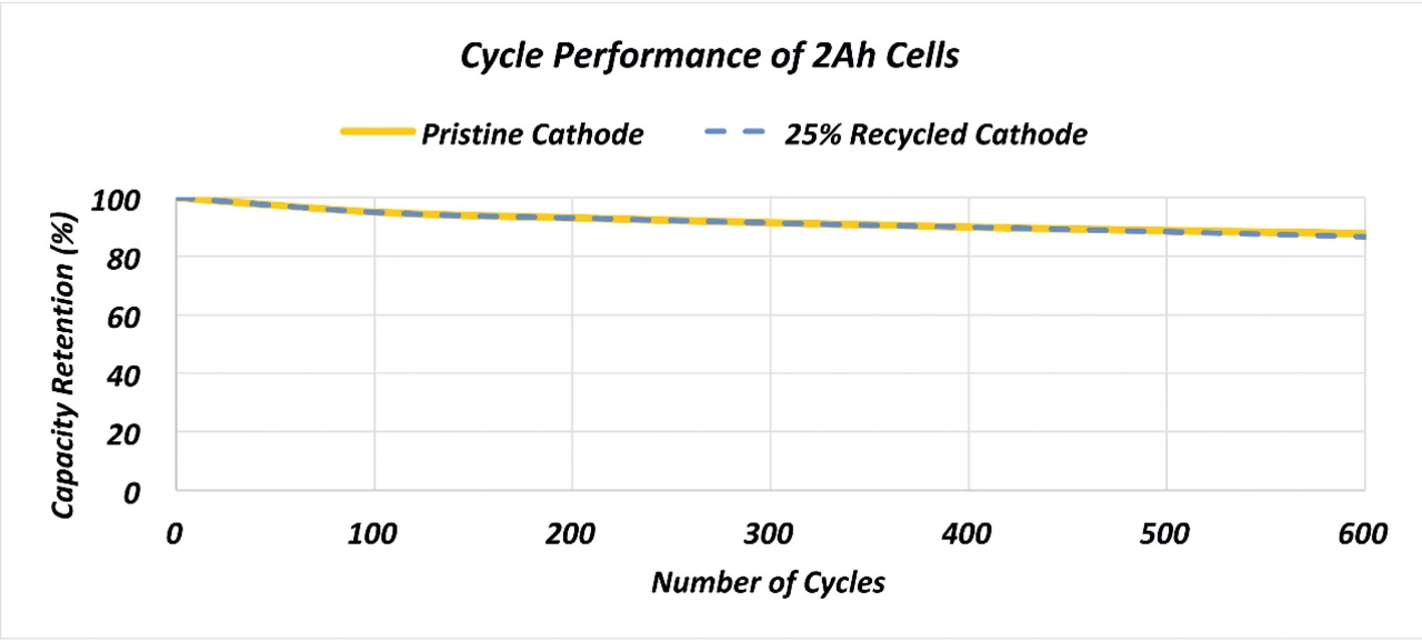 Interne Tests und die externe Validierung von 2-Ah-Musterzellen durch ein Labor des Energieministeriums der Vereinigten Staaten (US Department of Energy) haben gezeigt, dass die Leistung von Zellen mit recyceltem Kathodenmaterial selbst nach 600 Lade- und Entladezyklen vergleichbar ist mit der ihrer Gegenstücke aus ausschließlich neuem Kathodenmaterial.