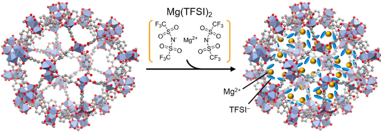 Das Team verwendete ein MOF namens MIL-101 als Grundgerüst und brachte dann Mg2+-Ionen in dessen Nanoporen ein. In dem daraus resultierenden MOF-basierten Elektrolyten war Mg2+ locker gepackt, sodass die zweiwertigen Mg2+-Ionen wandern konnten. Um die Ionenleitfähigkeit weiter zu verbessern, setzte das Forscherteam den Elektrolyten Acetonitril-Dämpfen aus, die vom MOF als Gastmoleküle adsorbiert wurden.