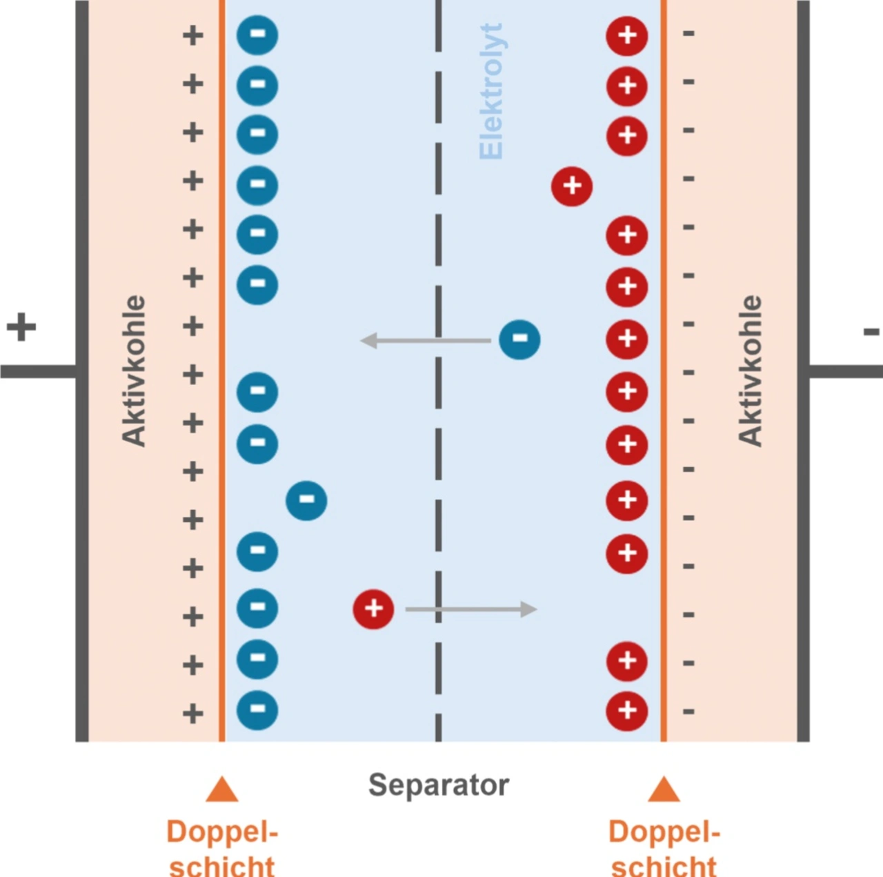 Kapazitive USV-Systeme speichern Energie in Doppelschichtkondensatoren, die elektrische Energie innerhalb von Sekunden aufnehmen und abgeben können. Während Batterien ihre Energie über chemische Vorgänge einlagern, nutzen Superkondensatoren ein rein physikalisches Prinzip: Ionen lagern sich an den Elektroden an und bilden dort eine Doppelschicht. Dadurch sind Lade- und Entladevorgänge äußerst schnell möglich und die Bauteile können ohne nennenswerte Alterung mehrere hunderttausend Zyklen überstehen. Sie bieten damit eine deutlich längere Lebensdauer als herkömmliche Batterien.