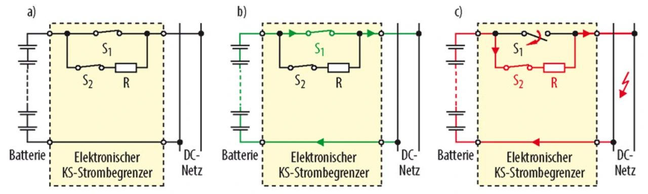 Bild 1a zeigt eine prinzipiell dazu geeignete technische Lösung. Im kurzschlussfreien Normalzustand fließt der Strom über den Schalter S1 (Bild 1b). Nach Kurzschlusserkennung wird dieser Schalter geöffnet. Der Strom fließt dann über den Schalter S2 und den strombegrenzenden Widerstand R (Bild 1c).