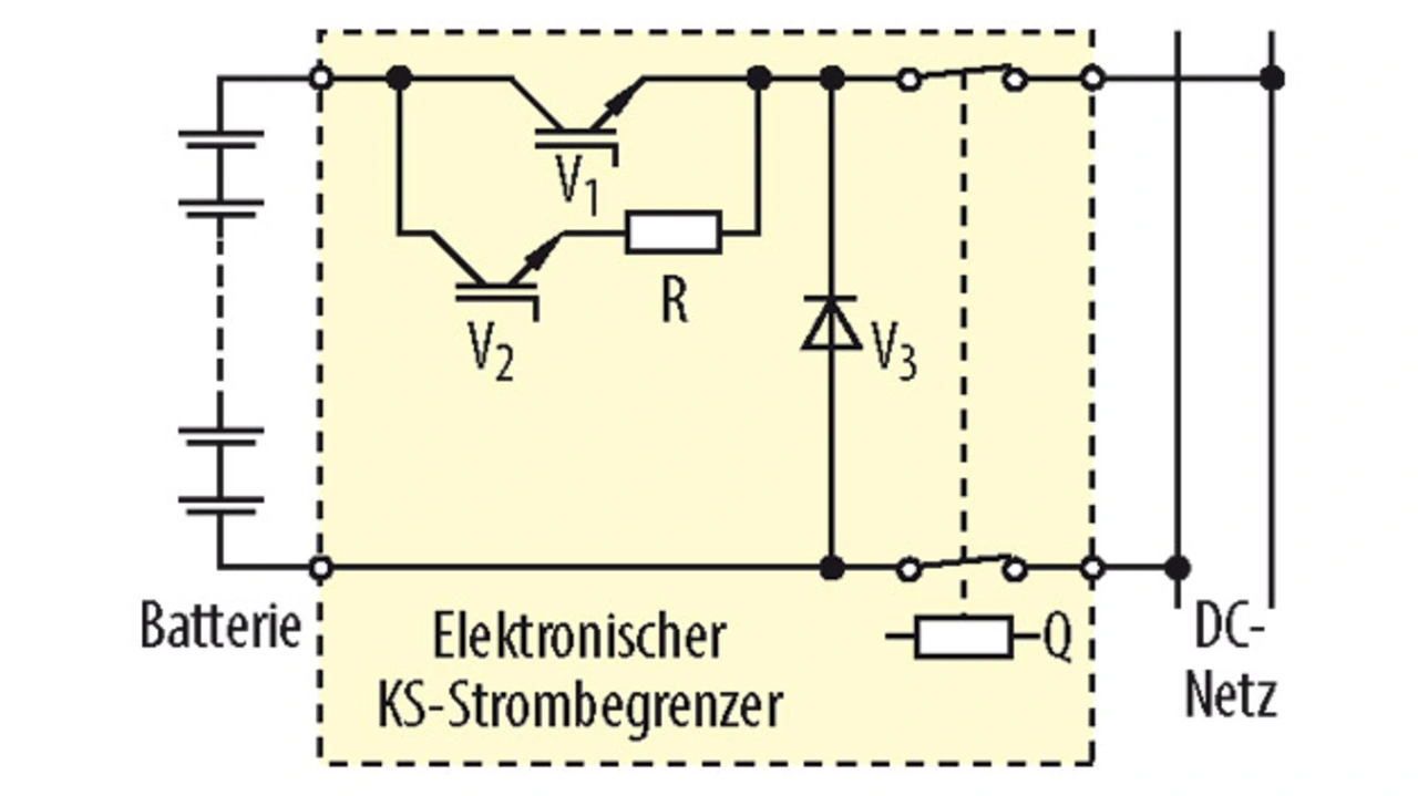Erfolgt das Zuschalten der Batterie nun dadurch, dass zuerst S2 (bzw. V2) eingeschaltet wird, wirkt der Widerstand R als Vorladewiderstand. Nach Abschluss des Ladevorgangs kann dann S1 (bzw. V1) geschlossen werden. Das optionale Schütz Q (Bild 2) kann auch hier wieder ohne Laststrom geschaltet werden, wenn dessen Kontakte noch vor S2 (bzw. V2) geschlossen werden.