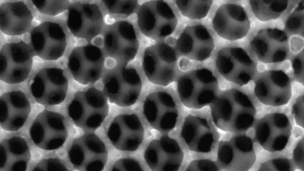 Damit die Germanium-Cluster die gewünschten porösen Strukturen bilden, entwickelte LMU-Forscherin Dr. Dina Fattakhova-Rohlfing eine Methode, die eine Nanostrukturierung ermöglicht: Winzige Polymerkügelchen bilden im ersten Schritt dreidimensionale Schablonen. Im nächsten Schritt füllt die Germaniumcluster-Lösung die Lücken zwischen den Kügelchen. Sobald sich auf der Oberfläche der Kügelchen stabile Germanium-Netzwerke gebildet haben, werden die Template durch Erhitzen herausgelöst. Übrig bleibt der porenreiche Nano-Film (Bild 1). Die eingesetzten Polymerkügelchen haben einen Durchmesser von 50 nm bis 200 nm und bilden eine Opalstruktur. Das Germanium-Gerüst, das an ihren Oberflächen entsteht, bildet die Negativform – eine inverse Opalstruktur. Die Nanoschichten schimmern daher wie Opal.