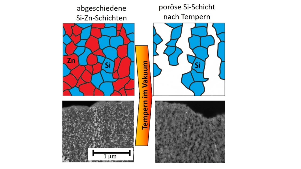 »Bei unserem Prozess werden zeitgleich Silizium und Zink auf Metallsubstraten abgeschieden. Durch eine anschließende Wärmebehandlung verdampft der Zinkanteil aus der Schicht und hinterlässt eine poröse Struktur im Silizium, die Platz für dessen Ausdehnung im Ladeprozess bietet und somit den Kapazitätsverlust minimiert«, erläutert Dr. Stefan Saager die Innovation. »Durch die Prozessparameter lässt sich die poröse Struktur manipulieren und auf die konkrete Batterieanforderung optimieren. Das Zink lässt sich dabei auffangen und perspektivisch im Prozess wiederverwenden.« Die porösen Siliziumschichten zeigen hinsichtlich ihrer Batterieperformance eine initiale Ladekapazität über 3.000 mAh/gSi und eine vergleichsweite gute Zyklenstabilität.