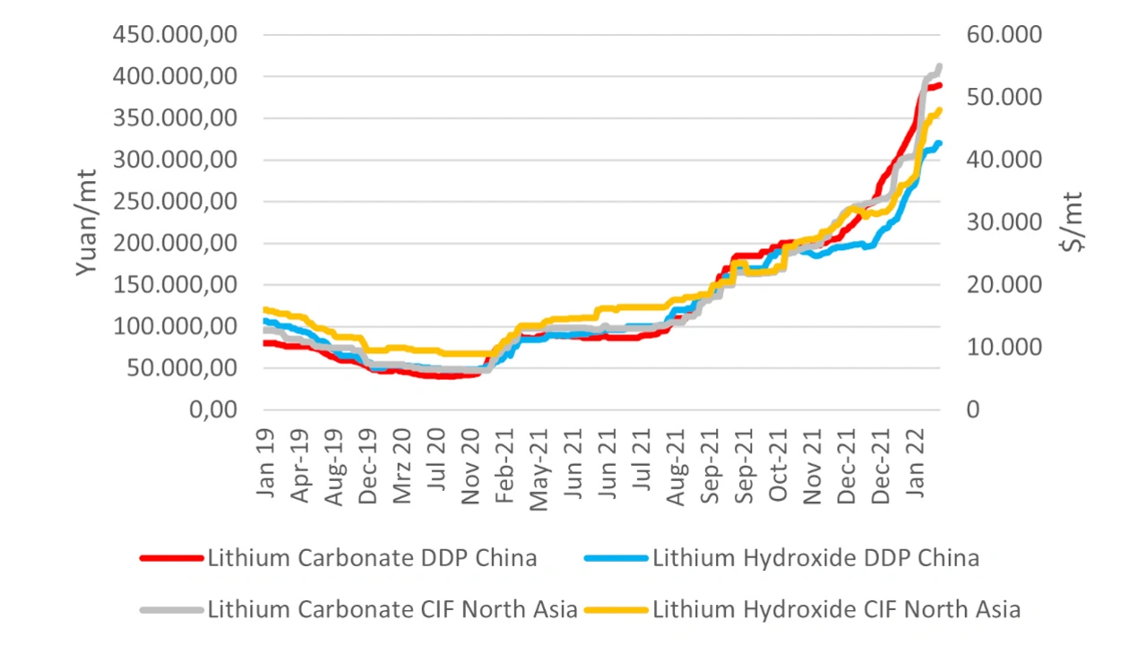 Die Preise für Batteriemetalle sind weiter in die Höhe geschnellt, wobei die Preise für Lithiumkarbonat nach wie vor Allzeithochs erreichen. Die jüngste Schätzung lag bei 71.000 US-Dollar pro Tonne und damit um fast 545 Prozent höher als im Vorjahr, was auf die steigende Nachfrage nach Elektrofahrzeugbatterien und das knappe Angebot zurückzuführen ist.