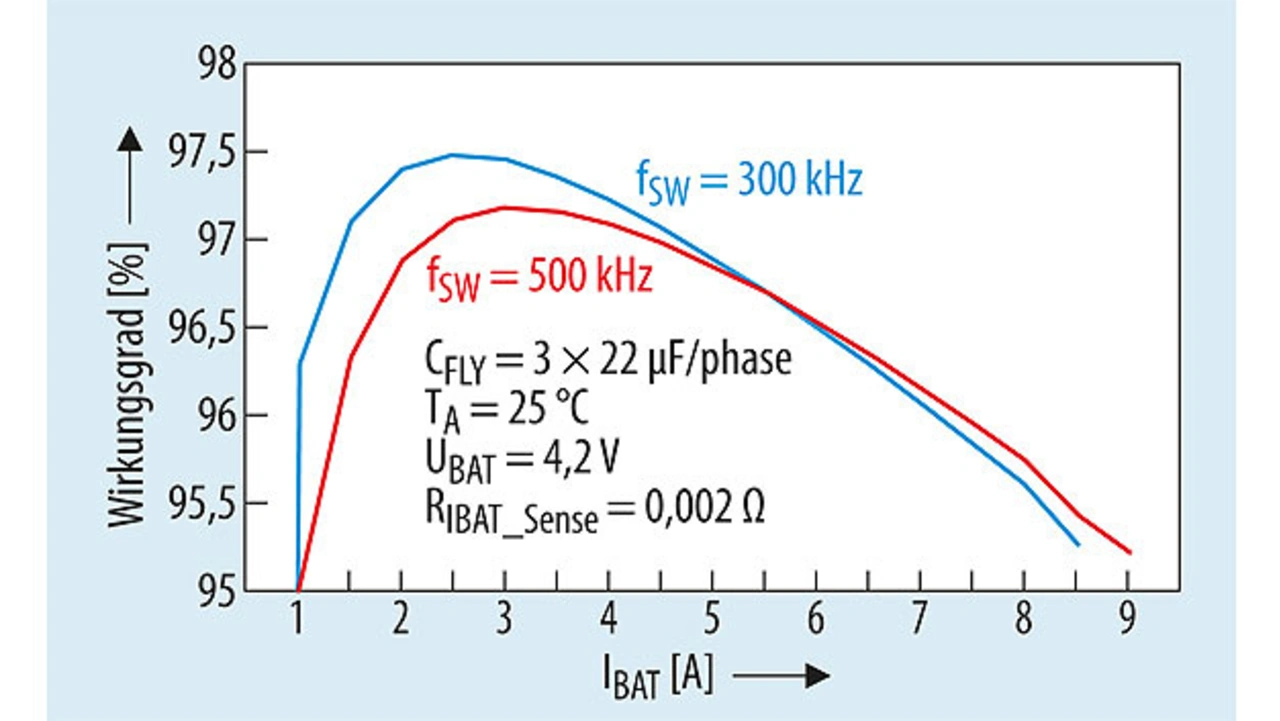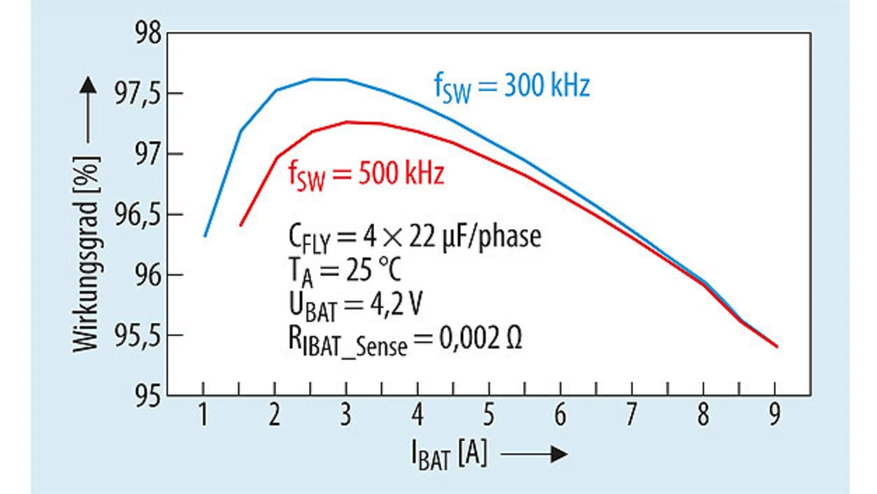 In den Bildern 5 und 6 ist der Wirkungsgrad des Switched-Capacitor-Akkuladers bq25970 dargestellt, wobei klar zu erkennen ist, wie sich die Zahl der Kondensatoren und die Schaltfrequenz auswirken.