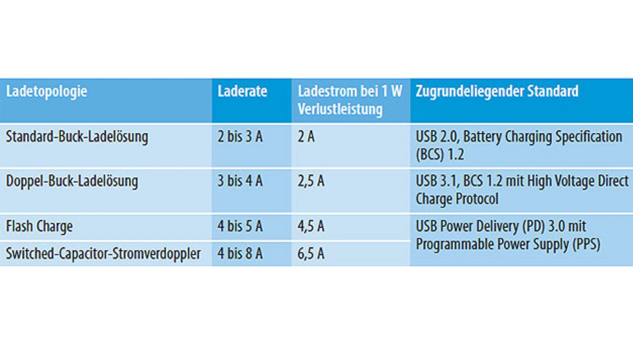 Smartphones sollen nach Möglichkeit immer länger mit einer Akkuladung auskommen und gleichzeitig soll das Aufladen immer schneller gehen. Das hat zur Folge, dass Smartphone-Akkus stetig größer werden und dass die Laderaten weiter steigen. Ein 3000-mAh-Akku muss für das Laden mit 6 A geeignet sein. Doch wenn mit derart hohen Strömen geladen werden soll, kommen der Wirkungsgrad des Ladegeräts und die Verlustleistung als begrenzende Faktoren ins Spiel. Tabelle 1 gibt einen Überblick über die Entwicklung hin zu immer schnelleren Ladelösungen.
