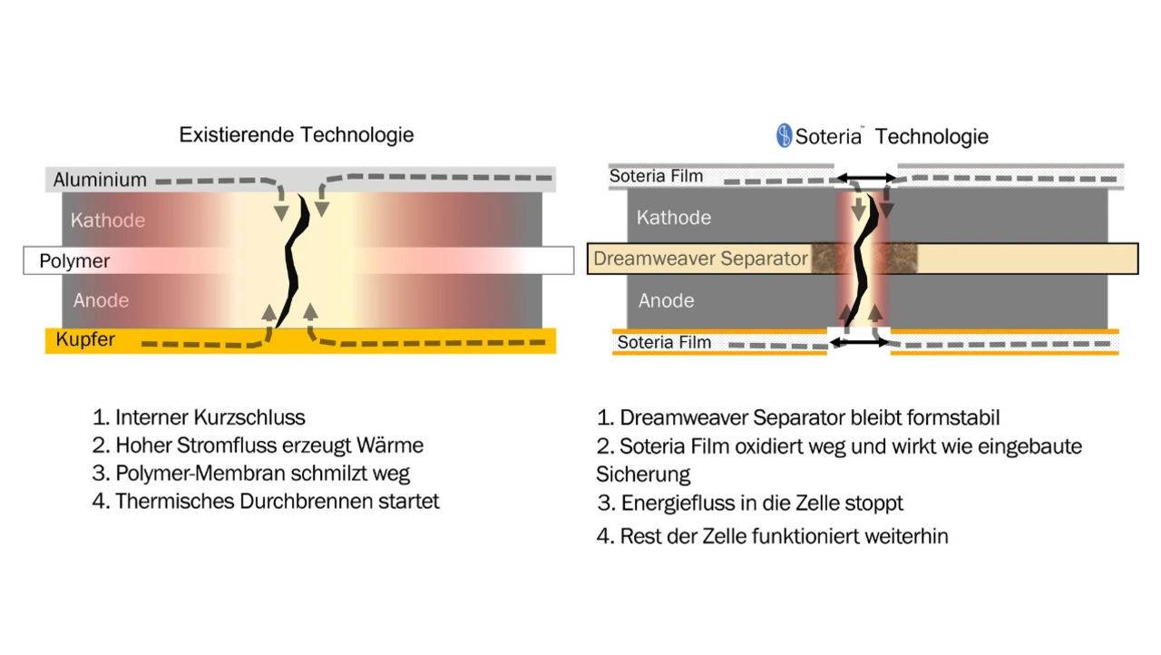 Die Separatoren, die heute hauptsächlich auf dem Markt zu finden sind, bestehen aus Polypropylen oder Polyethylen und sind in manchen Fällen zusätzlich beschichtet. Die Soteria-Technologie dagegen ist faserbasiert und besteht unter anderem aus Zellulose- und Aramidfasern, die eine sehr hohe thermische Beständigkeit aufweisen. Die Lithium-Ionen-Batterien funktionieren dadurch auch nach einer Beschädigung, was in kritischen Situationen, zum Beispiel bei Unfällen auf der Autobahn oder zukünftig in Drohnen oder Elektroflugzeugen während eines Fluges, ein zentraler Sicherheitsfaktor sein kann.