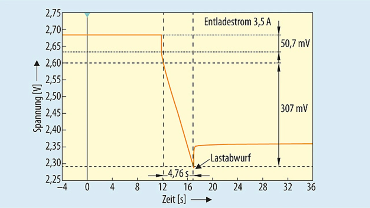 Die aktuelle bzw. tatsächliche Kapazität des Kondensators lässt sich ebenfalls mit Hilfe des Oszilloskops ermitteln. Aus dem konstanten Entladestrom – in unserem Beispiel 3,50 A – und der gemessenen Entladezeit (4,76 s) sowie des entsprechenden Spannungsabfalls an der Kapazität bis zum Abwurf der Last berechnet man: