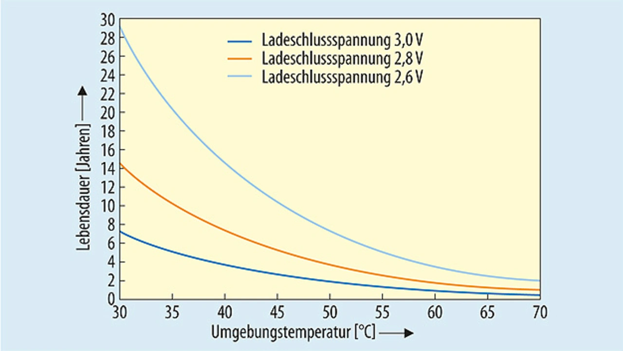 Das Diagramm in Bild 3 zeigt den direkten Zusammenhang von Temperatur und Lebensdauer bei unterschiedlichen Zellspannungen. Minus-Temperaturen bereiten den Supercaps – im Gegensatz zu Standard-Blei-Gel-Batterien – keine allzu großen Probleme, obgleich der Innenwiderstand bei niedrigen Temperaturen aufgrund der verminderten Ionenbeweglichkeit im Elektrolyt ansteigt. Das wird jedoch durch die resultierende Wärmeentwicklung im Supercap schnell wieder ausgeglichen.