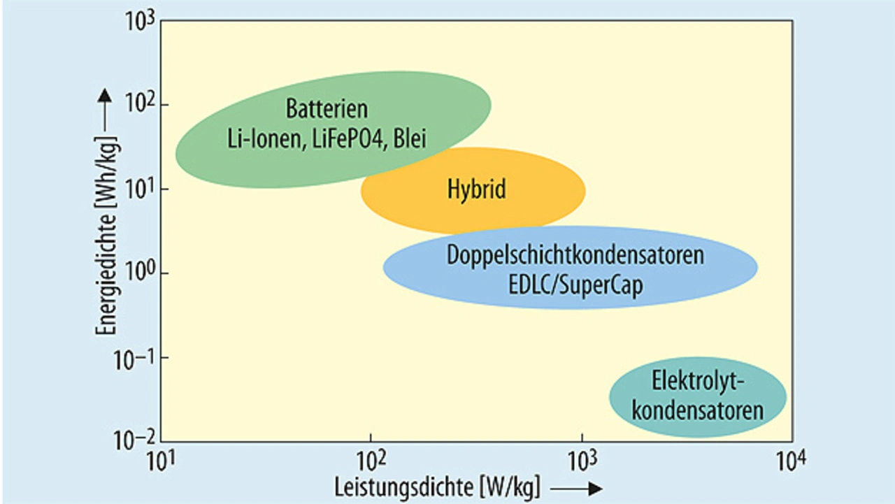Obgleich die schnellen Supercaps wie dargestellt beeindruckende Eigenschaften und Einsatzmöglichkeiten für die unterbrechungsfreie Stromversorgung bieten, gilt es bei der Gesamtkonzeption eines Systems immer nach wirtschaftlichen und technologischen Aspekten das optimale Energiespeicher-System auszuwählen. Hierbei sind zunächst die Unterschiede der Energiedichten (in Wh/kg) und Leistungsdichten (in W/kg) von Bedeutung (siehe Bild 4).