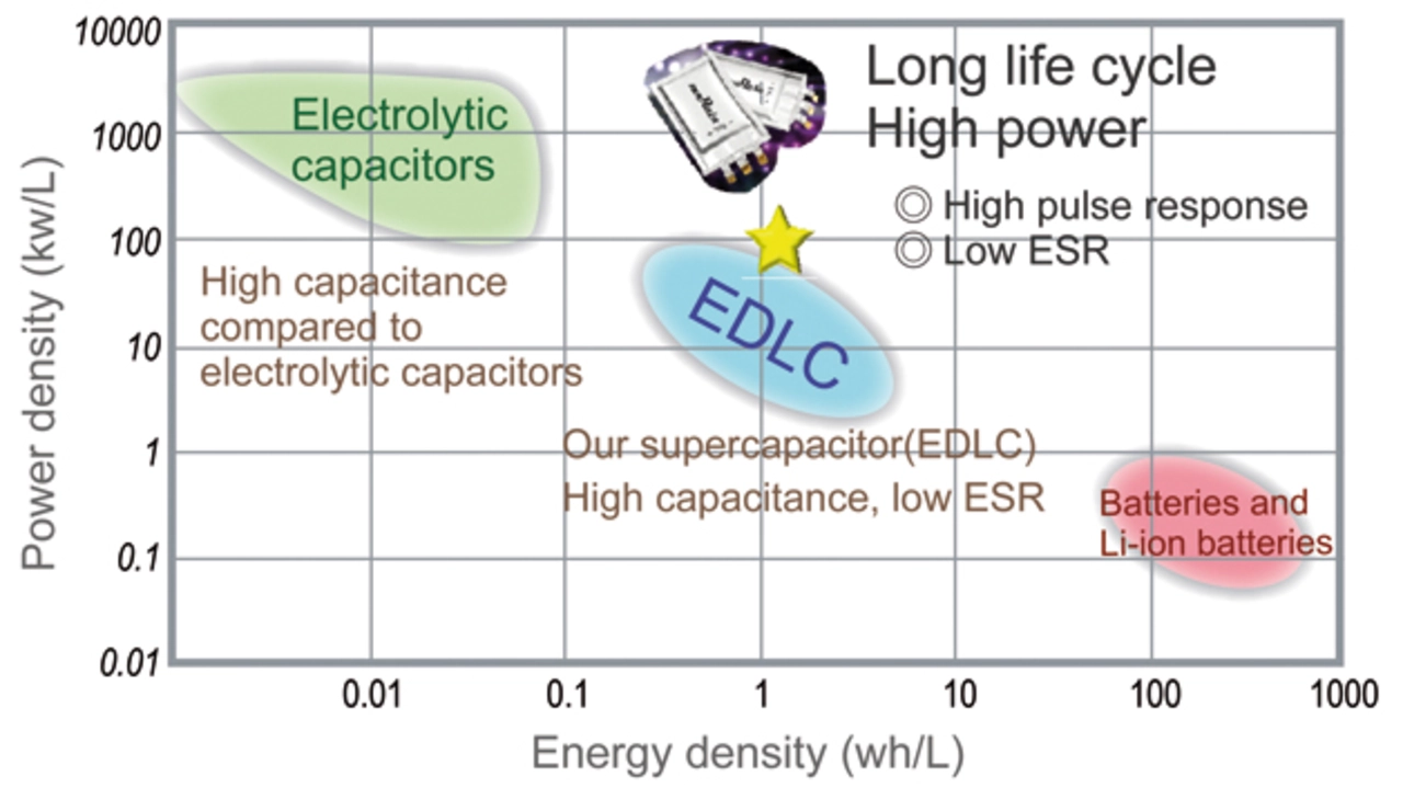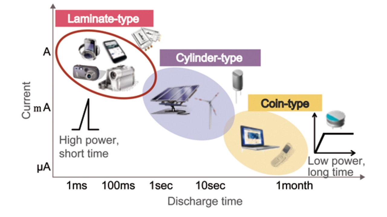 Wie in Bild 2 dargestellt, gibt es unterschiedliche Arten von Superkondensatoren. Bild 5 vergleicht nun die Entladeleistung von Superkondensatoren der verschiedenen Bauformen, wobei die Entladezeit auf der X-Achse und der Entladestrom auf der Y-Achse aufgetragen sind. Superkondensatoren in Knopf-Bauform sind durch einen lange andauernden, niedrigen Strom gekennzeichnet. Dies ist die konventionelle, ursprüngliche Bauform eines Superkondensators. Bei der Laminat-Bauform fließt dagegen sofort ein großer Strom. Zwischen diesen beiden Bauformen ist die zylindrische Variante einzuordnen. Konventionelle Superkondensatoren eignen sich bestens für Anwendungen, in denen augenblicklich viel Leistung benötigt wird.