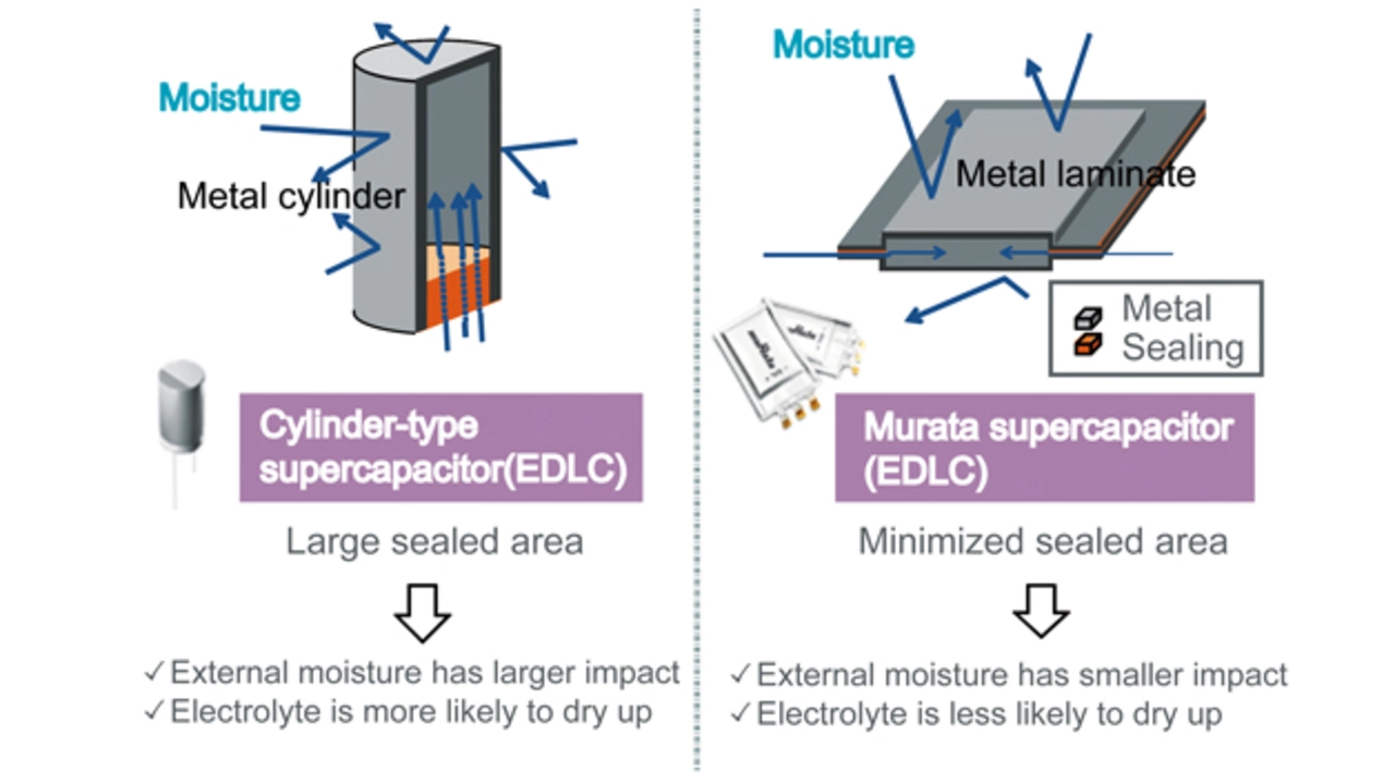 Im Allgemeinen verschlechtern sich die Eigenschaften von Superkondensatoren im Lauf der Zeit durch den Einfluss externer Feuchtigkeit. Ein weiteres Problem sind Ausfälle durch Austrocknen des Elektrolyten. Diese Nachteile wurden bei einigen Superkondensatoren behoben, auch für die neue Generation von Murata. Da die Feuchtigkeit aus dem versiegelten Bereich in das Gehäuseinnere vordringt, weisen die Superkondensatoren von Murata einen kleineren versiegelten Bereich auf. So wird das Eindringen von Feuchtigkeit verhindert (Bild 6). Anders als Superkondensatoren in zylindrischer Bauform, die in erheblichem Maß von Feuchtigkeit beeinträchtigt werden, weist diese Bauart weniger Feuchtigkeitsschäden auf. Ihre Konstruktion mit einem minimierten versiegelten Bereich trägt außerdem dazu bei, das Verdampfen des Elektrolyten zu unterbinden, das sonst für Ausfälle durch Austrocknung sorgt. Unter dem Strich wurde durch diese Maßnahmen gegenüber konventionellen Superkondensatoren ein sehr hohes Maß an Zuverlässigkeit erreicht.