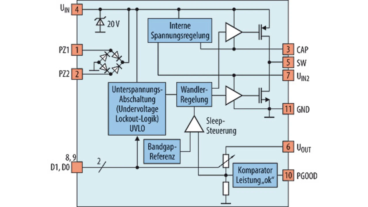 Der Ringkern wird an PZ1 und PZ2 angeschlossen. Intern wird die Eingangswechselspannung im Bereich von 2,7–20 V gleichgerichtet und auf eine per D0 und D1 einstellbare konstante Ausgangsgleichspannung zwischen 1,8 und 3,6 V gewandelt. Höhere Eingangsspannungen als 20 V werden durch eine interne Schutzdiode begrenzt. Ein Speicherkondensator (z.B. 470 µF) wird an VIN angeschlossen und dient als Energiespeicher für den nachgeschalteten Abwärtswandler. Dieser kann am Ausgang einen konstanten Strom von bis zu 100 mA zur Verfügung stellen. Eine Undervoltage-Lockout-Logik (UVLO) stellt sicher, dass der Abwärtswandler nur dann arbeitet und die eingestellte Spannung ausgibt, wenn am Speicherkondensator eine ausreichend hohe Spannung anliegt. Erst wenn die Spannung Vin über einem definierten Schwellenwert (ca. 4,2 V) liegt, wird der interne Abwärtswandler in Betrieb genommen. Der Power-Good-Ausgang signalisiert dabei das Erreichen der stabilen Ausgangsspannung. Eine Hysterese in der Logik sorgt dafür, dass die Ausgangsspannung bis zum Erreichen der UVLO-Spannung (ca. 300 mV über der eingestellten Ausgangsspannung) gehalten und erst unter dieser Schwelle der Abwärtswandler ausgeschaltet wird, was durch die Auswertung des Power-Good-Signals, typischerweise von einem Mikrocontroller, zu detektieren ist.