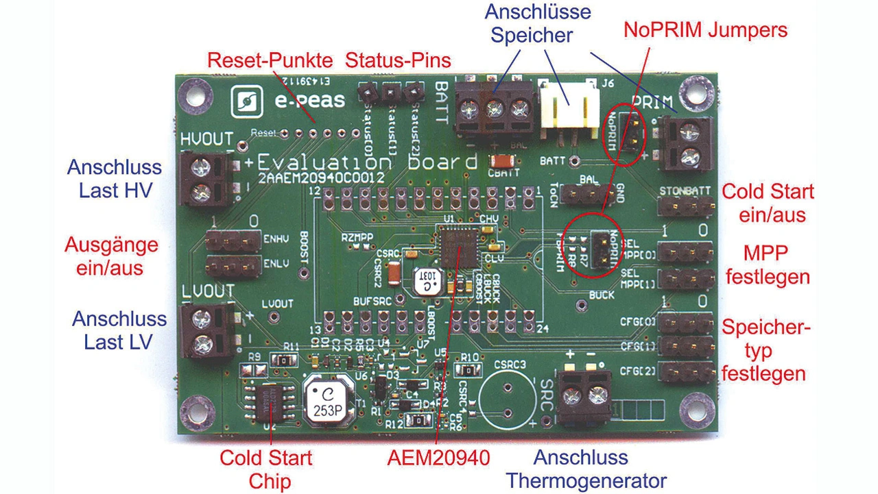 Es können zwei unterschiedliche Speichertypen gleichzeitig zum Einsatz kommen. An den PRIM-Anschluss (Bild 3) soll das Hauptspeicherelement (Primary Battery) angeschlossen werden, was im AEM20940 User Guide als »Mandatory Connection« (verpflichtend) angegeben wird. Welcher Typ mit welcher Spannung hier der richtige ist, wird in keinem der Dokumente angegeben, sondern nur, dass hierfür ein »Protection Level« mit zwei externen Widerständen (R7, R8) festzulegen ist und die Spannung zwischen 0,6 und 5 V liegen muss. Die Widerstände sind neben dem zweiten NoPRIM-Jumper (Bild 5) direkt auf die Platine zu löten.