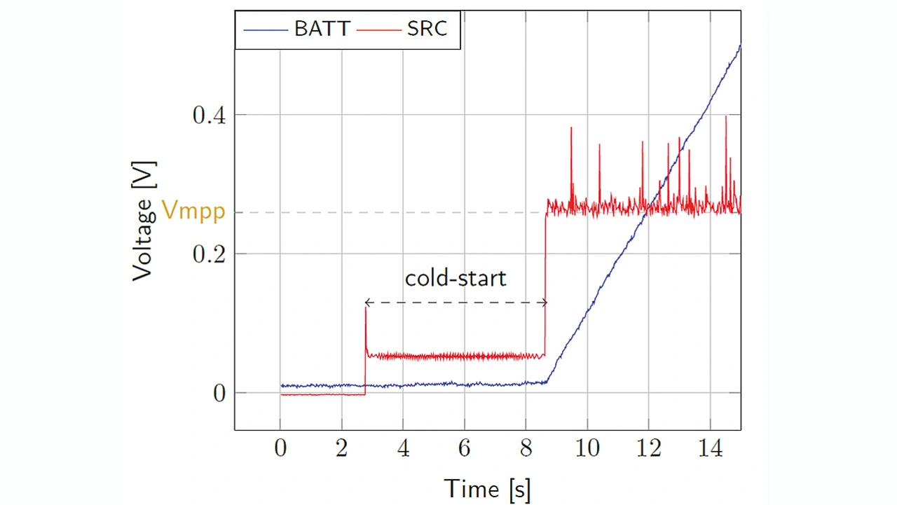 Statt einen Thermogenerator anzuschließen, ist für den Test eine Stromquelle mit 5 mA bei einer Compliance-Spannung von 100 mV einzusetzen. Das Verhalten des Chips lässt sich dann an den drei Status-Pins messen. Status[0] signalisiert, dass die LDOs aktiviert sind, d. h. der Chip normal arbeitet. Status[1] zeigt, dass die Spannung des Energiespeichers unter VOVDIS gefallen ist oder dass die Energie momentan von der Primary-Battery bezogen wird, und Status[2], dass der Chip gerade eine MPP-Messung ausführt.
