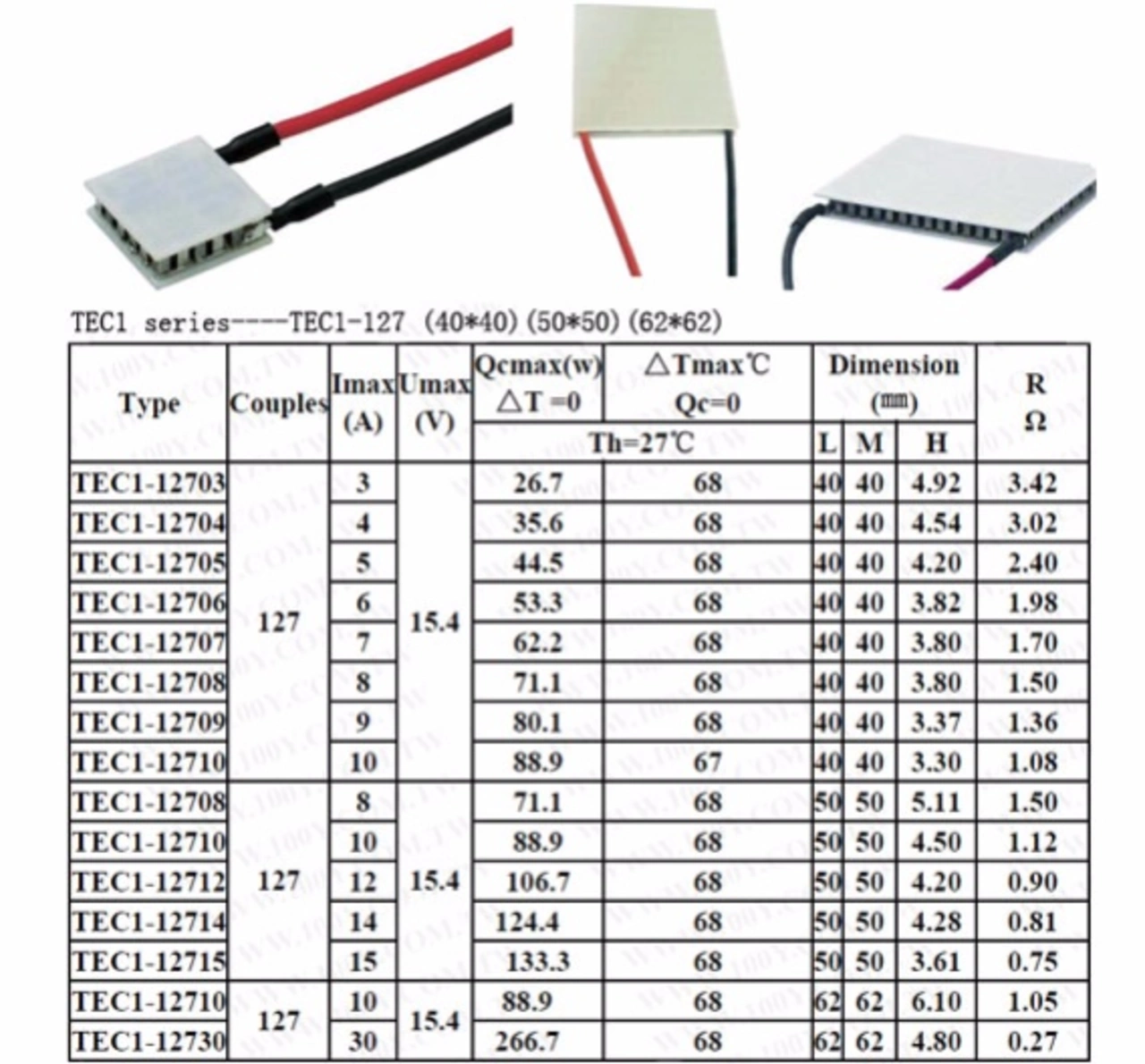 Peltier-Elemente werden traditionell zur Temperierung verwendet und verfügen über eine heiße und eine kalte Seite. Gleichwohl können solche Elemente umgekehrt auch aus Temperaturdifferenzen elektrischen Strom erzeugen, sofern sie aus geeigneten Materialien aufgebaut sind. Peltier-Elemente, wie sie meist für die Kühlung zum Einsatz kommen, sind im Gegensatz zu den spezielleren Seebeck-Elementen recht preisgünstig. Sie sind bei den bekannten Elektronik-Versendern oft sogar als Restposten erhältlich und empfehlen sich somit für eigene Experimente. Verbreitet sind hier die Typen der TEC1-Serie der Firma Centenary Materials, die von zahlreichen Firmen vertrieben werden (Bild 5). Mit einem Element wie dem TEC1-12704 (4 cm × 4 cm) ist es innerhalb von Sekunden möglich, Spannungen von über 50 mV durch das Auflegen auf einen warmen Raumheizkörper zu generieren. Zu beachten ist dabei, dass die eine Seite des Elements − etwa mithilfe eines Kühlkörpers − ausreichend gekühlt wird, damit die maximal erlaubte Temperaturdifferenz von 68 K nicht überschritten wird.