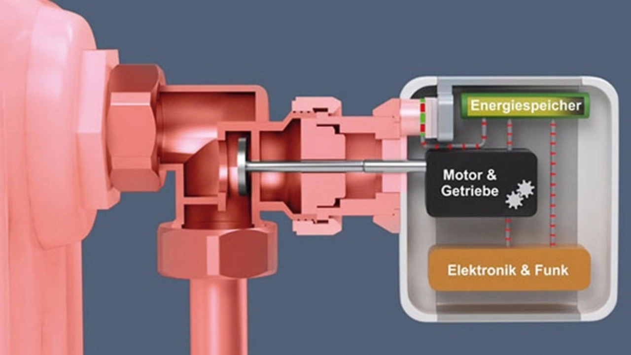 Package (Packed Chips, Bild 6) und auch als einsatzbereite Systeme mit Microcontroller und unterschiedlichen Funkschnittstellen auf Modulen (TE Power One, TE Power Node, TE Power Core) an. Als Anwendung gibt es seit Anfang 2015 außerdem den Heizkörper-Stellantrieb iTRV, was insbesondere im Zusammenhang mit Smart Homes Aussicht auf Erfolg hat. Der Antrieb wird entweder per EnOcean-Funk oder per Bluetooth (iTRV Blue) gesteuert und gewinnt die Energie für den Stellmotor und die Funkschnittstelle mithilfe eines integrierten Thermogenerators, der sich zwischen der warmen Seite des Wassers vom Heizungsvorlauf und dem Ventil zum Raum hin befindet (Bild 7). Die Differenz zwischen der Raumtemperatur und der Vorlauftemperatur des Heizkreises reicht für den Betrieb des wartungsfreien Stellantriebes aus.