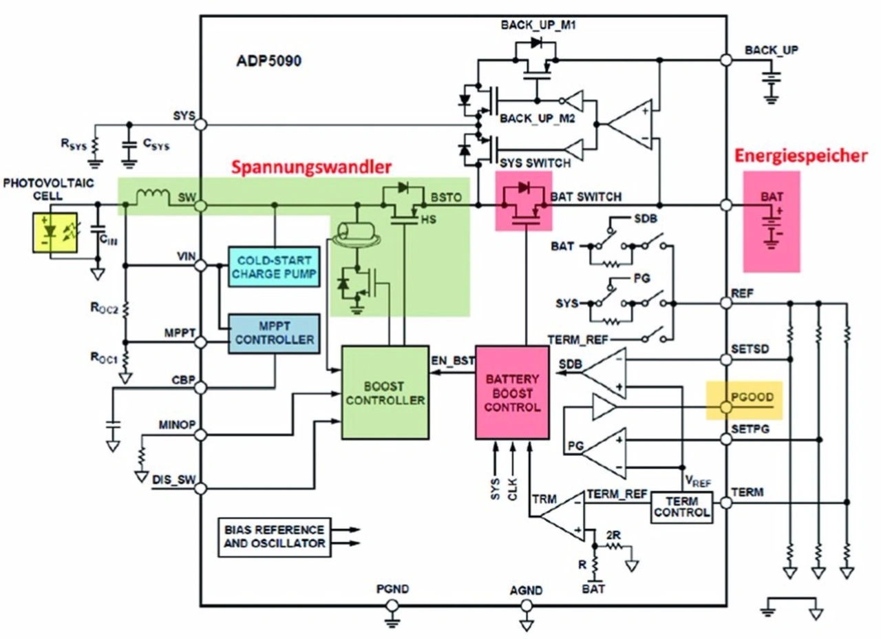 Der ADP5090 (Bild 5) von Analog Devices war der erste PMIC am Markt, der zusätzlich eine Backup-Batterie unterstützte, was als nette Beigabe erscheinen mag. Gleichwohl kann dieses Feature neue Entwicklungen sehr vereinfachen, wenn man sich nicht allein auf den Harvester für die Versorgung einer Applikation verlassen kann und will, sondern ein eingebauter Harvester als zusätzliche, unterstützende Quelle fungieren soll. Um das MPPT mittels FOCV zu konfigurieren, ist ebenfalls ein Spannungsteiler nötig. An diesem wird die Spannung gemessen, auf den der Aufwärtswandler seine Eingangsspannung einstellen soll.