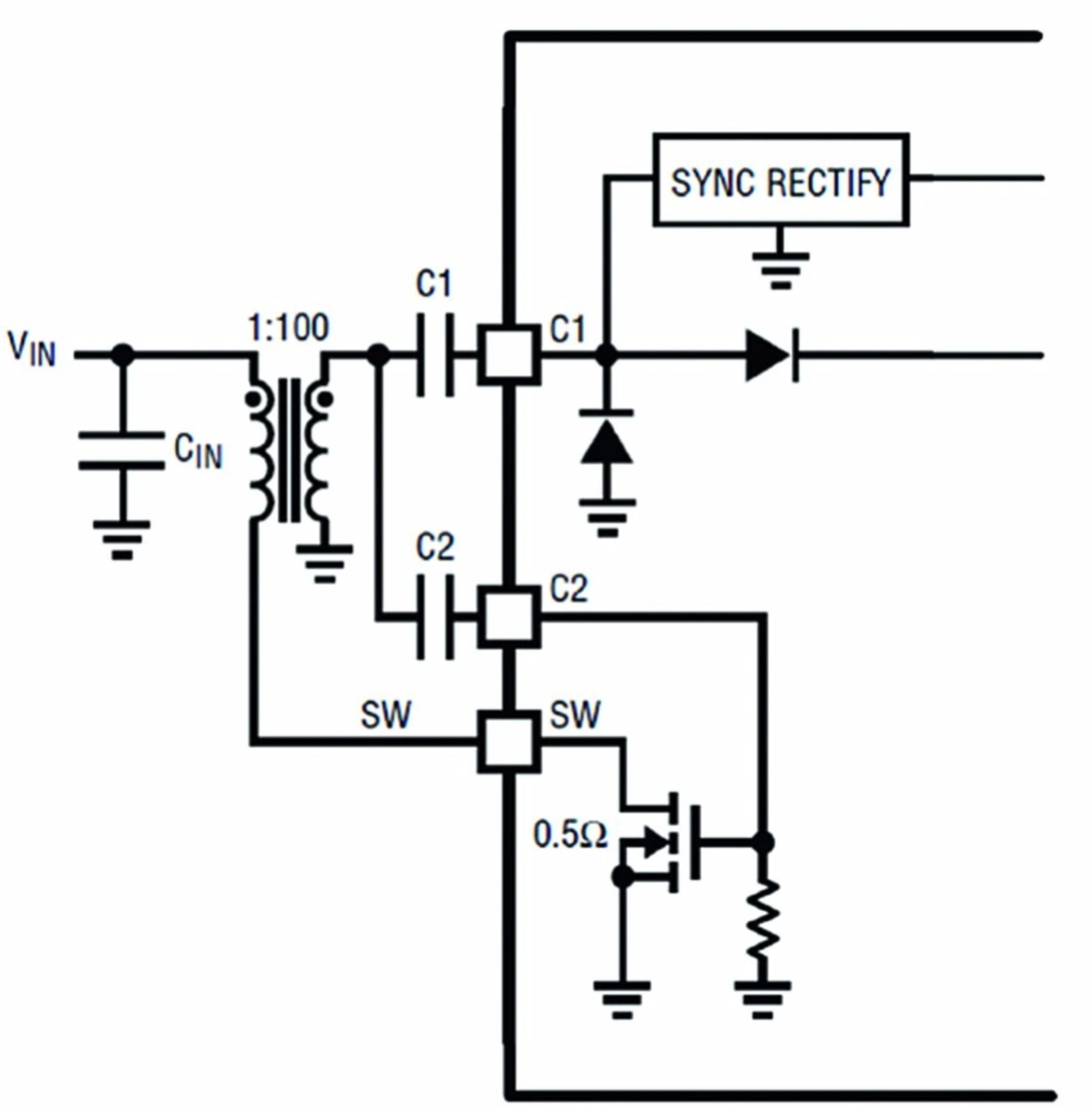 Die Typen LTC3107, LTC3108 und LTC3109 haben Wechselspannungseingänge, obwohl sie für die Verwendung mit Thermogeneratoren spezialisiert sind, denn anstelle eines üblichen Aufwärtswandlers wird hier ein Transformator verwendet, um die Eingangsspannung hochzusetzen (Bild 6). Die Wechselspannung wird dabei von einem MOSFET generiert, der direkt von der sekundärseitig induzierten Spannung angesteuert wird. Aufgrund des hohen Übersetzungsverhältnisses (1:20 bis 1:100) und einer zusätzlichen Ladungspumpe lassen sich sehr geringe Eingangsspannungen von weniger als 100 mV nutzbar machen, was insbesondere für TEGs bei geringen Temperaturdifferenzen von wenigen Kelvin geeignet ist, was mit anderen PMICs so nicht möglich ist.