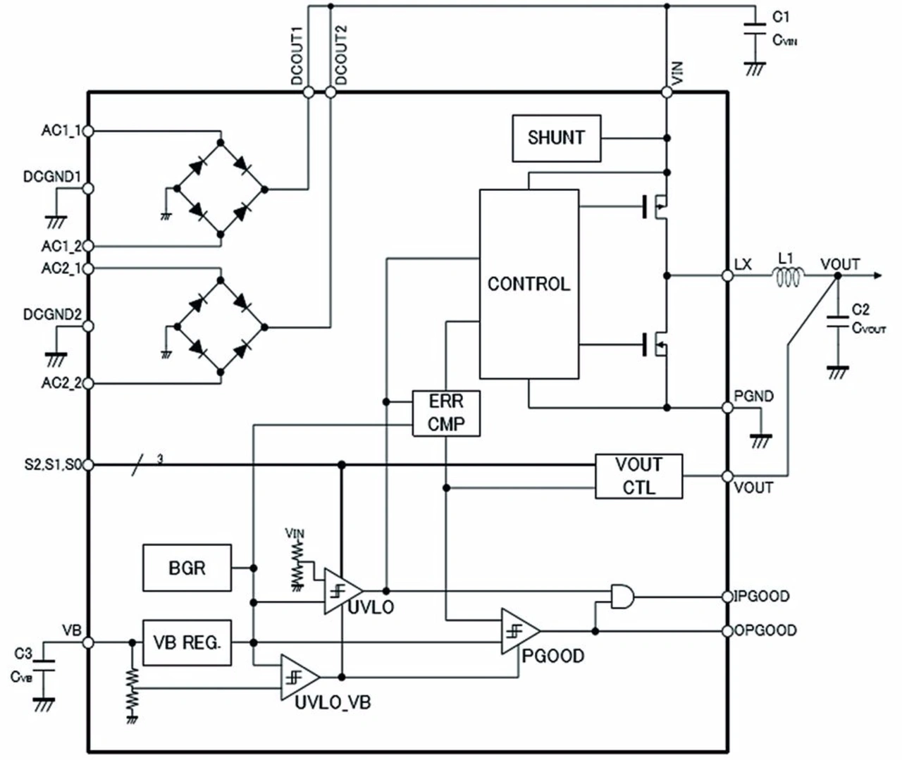 Während die S6SAE10xA-Reihe auf Solarzellen fokussiert ist, bezeichnet Cypress den MB39C811 (Bild 8) als General-Purpose-PMIC. Er besitzt gleich zwei passive Brückengleichrichter und erlaubt damit das parallele Harvesting aus mehreren Wechsel- und Gleichspannungsquellen von 2,6 V bis 23 V. Über zwei digitale Pins wird zudem der Status von Eingangs- und Ausgangsspannung übermittelt (Input Power Good, Output Power Good).