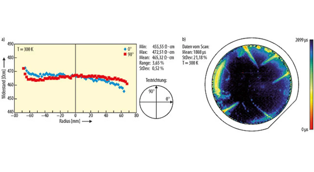 Der gegenwärtige Stand der Technik in der Silizium-Wafer-Technologie ermöglicht die Herstellung von hochreinen und fehlerfreien n-Fließzonen-Silizium-Wafern, die für hohe Sperrspannungen von bis zu 9,5 kV benötigt werden. Diese Wafer werden über Neutronenumwandlungen dotiert, um eine homogene Widerstandsverteilung über den gesamten Wafer in der n-Zone zu erreichen (Bild 2a). Der spezifische Widerstand befindet sich im Bereich von 430 Ω/cm bis 500 Ω/cm. Die typische Standardabweichung für einen vorgefertigten Wafer beträgt weniger als ein Prozent.