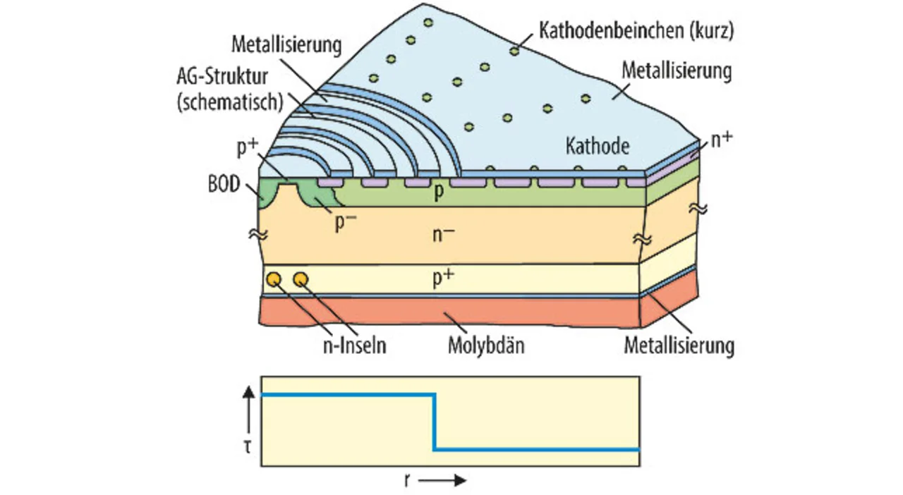 Die Vorteile des durch Lichtimpuls gezündeten Thyristors können ausgenutzt werden, wenn sichere. fehlerausschließende Strukturen implementiert sind, die das Gerät für den Fall schützen, dass die Grenzen der Vorwärts-Sperrspannung oder die Spannungssteilheit dU/dt überschritten werden. Die integrierte Überspannungs-Schutzfunktion durch Breakover-Diode (BOD) bietet hierfür ein effizientes und zuverlässig gesteuertes Einschalten, wenn die Vorwärts-Sperrspannung Werte zwischen 8 und 9,5 kV [3] erreicht. Neben dieser Überspannungs-Schutzfunktion wurde ebenfalls eine dU/dt-Schutzfunktion in den Thyristor integriert [4].