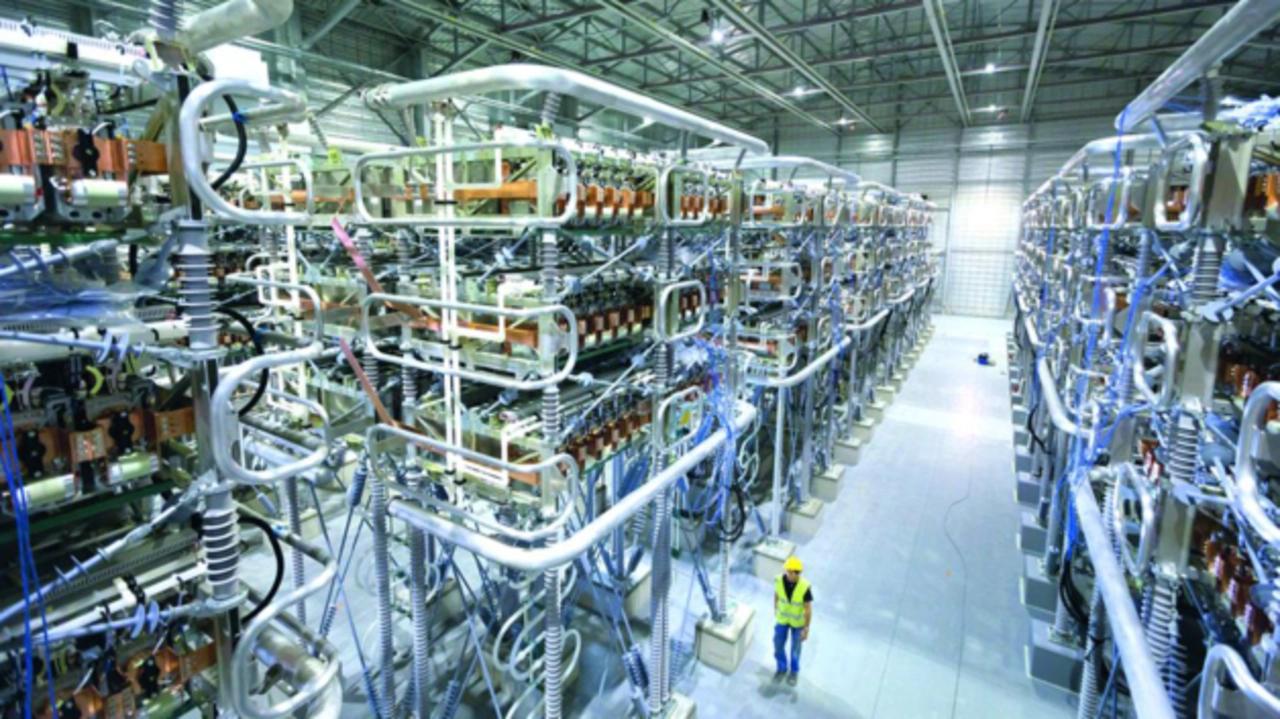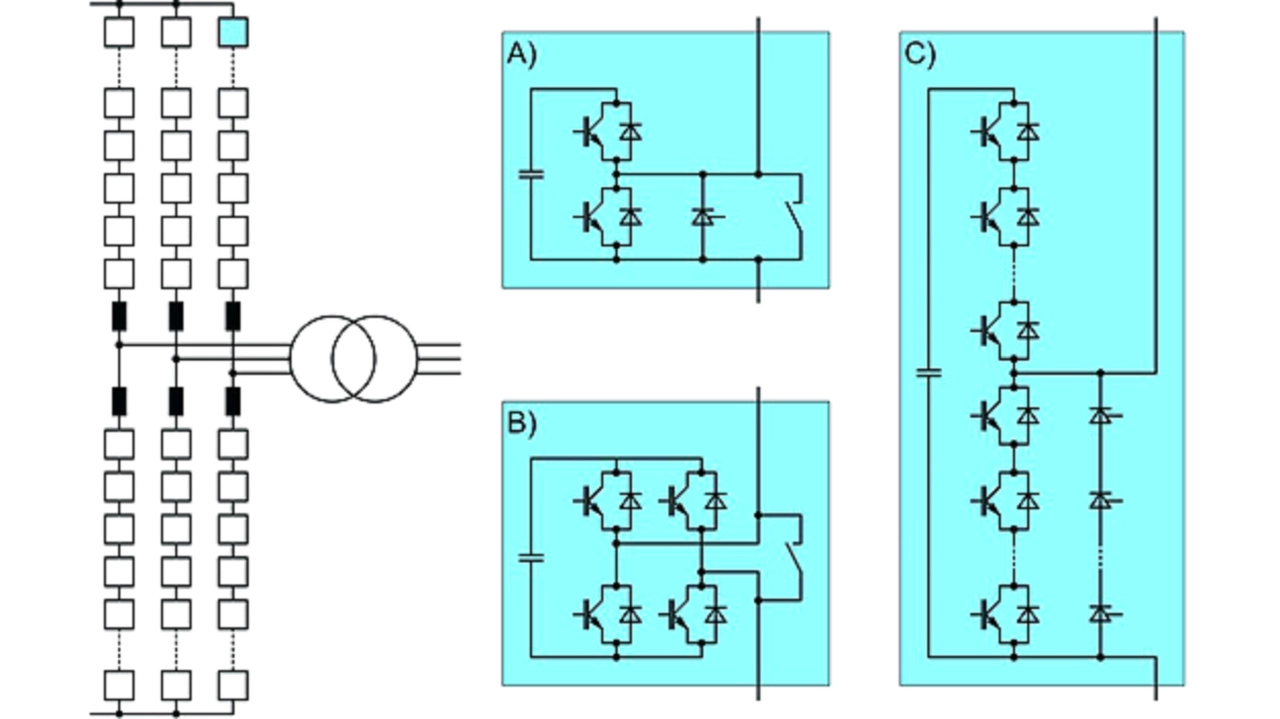 Die Alternative zum Zweipunkt- oder Dreipunktumrichter ist der von Prof. Marquardt vorgeschlagene modulare Multilevel-Umrichter (MMC; Bild 5 und 6), der heute die Standard-Topologie für selbstgeführte HGÜ-Umrichter ist. Zwischen DC-Plus und den drei AC-Phasen sowie diesen und DC-Minus sind jeweils bis zu einige hundert identisch aufgebaute Submodule in Reihe geschaltet. Jedes Submodul enthält seinen eigenen Zwischenkreiskondensator und eine IGBT-Phase. An den Klemmen des Submoduls kann damit entweder die lokale Zwischenkreisspannung oder die Spannung Null eingestellt werden. Da sich alle Submodule unabhängig voneinander schalten lassen, kann die Ausgangsspannung so viele Stufen erhalten, wie Submodule in Reihe geschaltet wurden. Dies führt zu einer nahezu perfekt sinusförmigen Ausgangsspannung. Weitere Filter sind nicht mehr erforderlich.