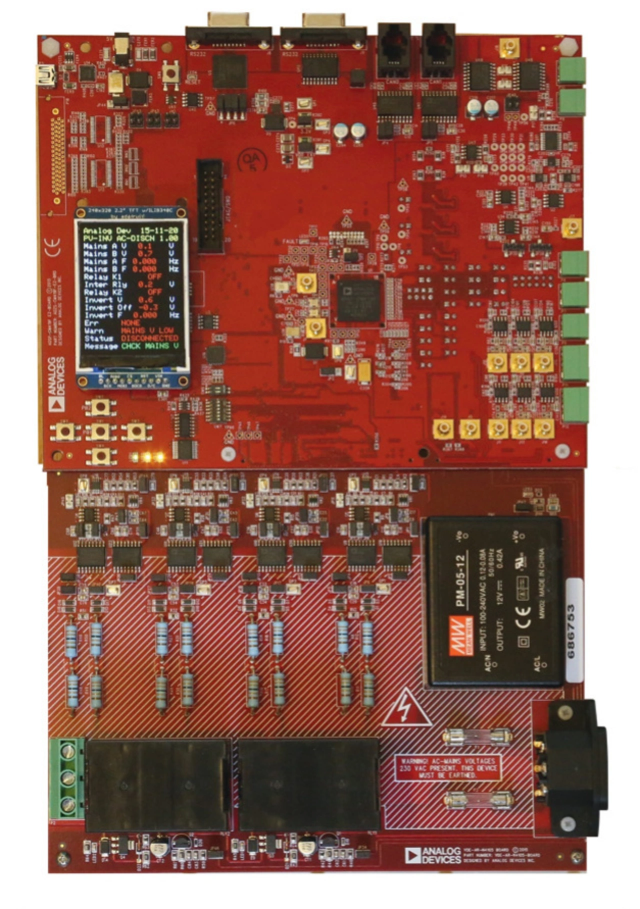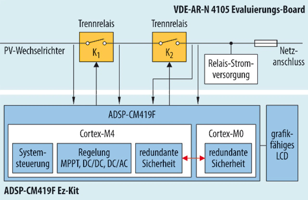 Zusätzlich zum Mixed-Signal-Mikrocontroller gibt es eine Reihe anderer entscheidender Komponenten, die bezüglich Kommunikation, Steuerung und der sicheren Weiterleitung von Daten in einem PV-Wechselrichter zusammenarbeiten müssen. Die Schaltung des Evaluierungs-Boards (Bild 3) basiert auf einem redundanten Signalpfad-Konzept inklusive redundanter Referenzen, ADCs und Taktquellen sowie internen Überwachungsstufen für Oszillatorfrequenz und Spannung und eine Inter-Prozessor-Kommunikation (Mailbox-System). Es erlaubt, die zusätzliche, bisher extern realisierte Überwachungsschaltung komplett aus dem Überwachungssystem zu eliminieren. Ein grafikfähiges LCD liefert dem Entwickler alle relevanten Status-Informationen auf einen Blick. Mit einem einfachen Knopfdruck wird ein Kalibrierungszyklus des gesamten Steuer-, Regel- und Überwachungsssystems angestoßen. Analog Devices liefert das 4105-Evaluierungs-Board kombiniert mit dem ADSP-CM419F Ez-Kit (Bild 4) mit einem entsprechend dokumentierten Software-Paket aus. Für das 4105-Evaluierungs-Board hat der TÜV Süd im März 2016 die Konformität mit der VDE-Anschlussregel VDE-AR-N-4105 [1] bestätigt.