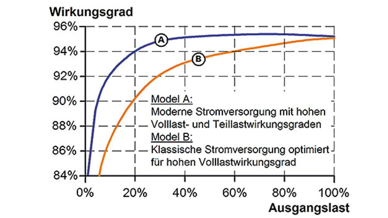 Selbst wenn die veröffentlichten Volllast-Wirkungsgrade zweier Netzteile gleich sind, muss man sich darüber im Klaren sein, dass es bei den Teillast-Wirkungsgraden (unter realen Bedingungen) erhebliche Unterschiede geben kann (Bild 1).