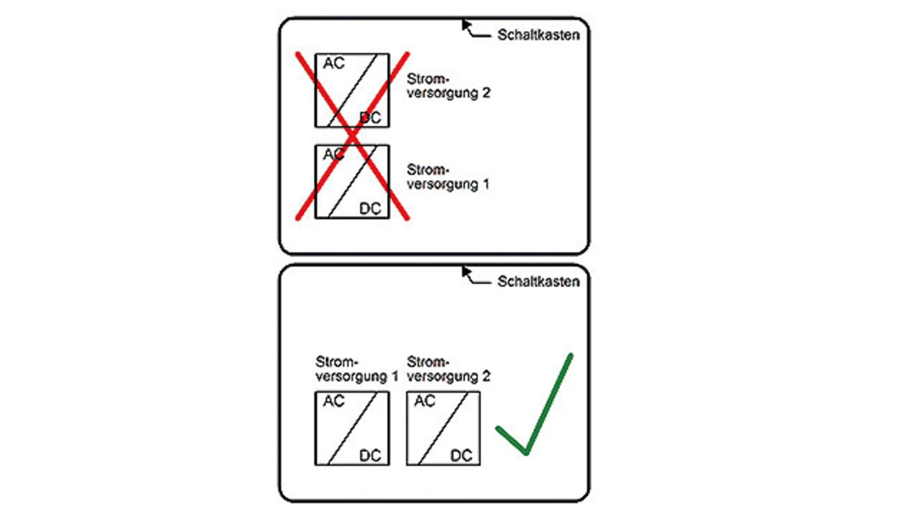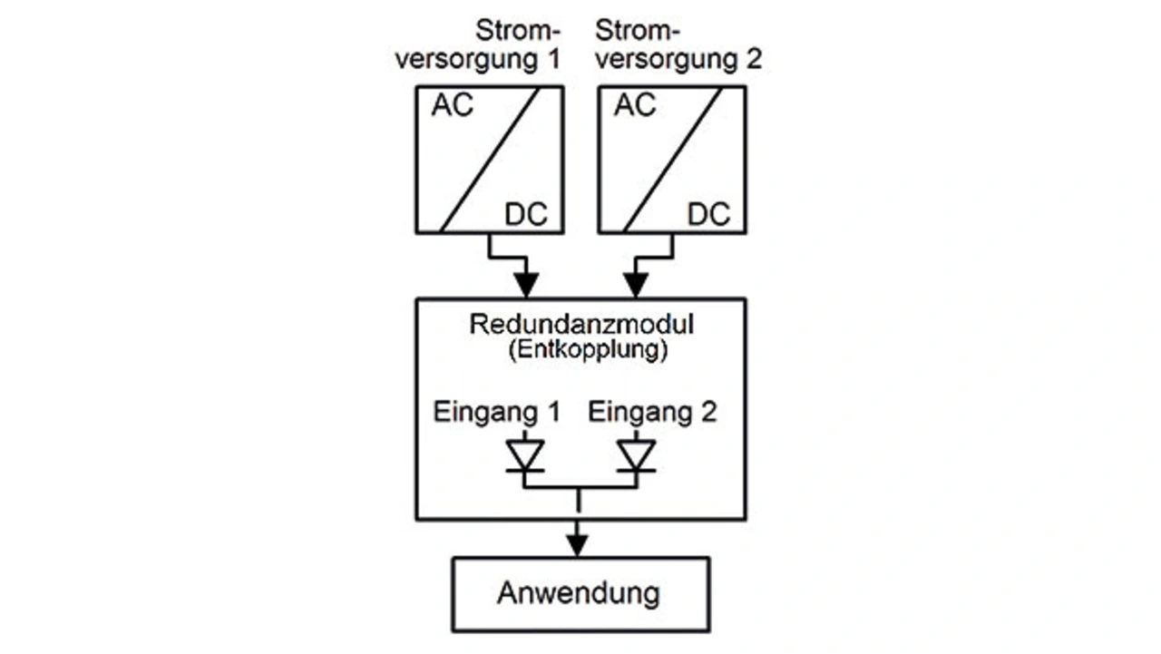 Bei einer redundanten Konfiguration müssen die Ausgänge der Geräte voneinander entkoppelt werden, damit ein defektes Gerät nicht zur Last für das verbleibende funktionierende Gerät wird. Zu diesem Zweck haben einige Modelle bereits eine Entkopplungsmaßnahme eingebaut (ORing Diode oder MOSFET), oder es wird ein externes Redundanzmodul zur Verbindung der Ausgänge verwendet (Bild 5). Fällt eine Stromversorgung aus, springt die andere sofort und nahtlos ein. Es ist wichtig, dass die Funktion beider Stromversorgungen überwacht wird und Fehler gemeldet werden. So können Korrekturmaßnahmen eingeleitet werden, um einen Fehler zu beheben.