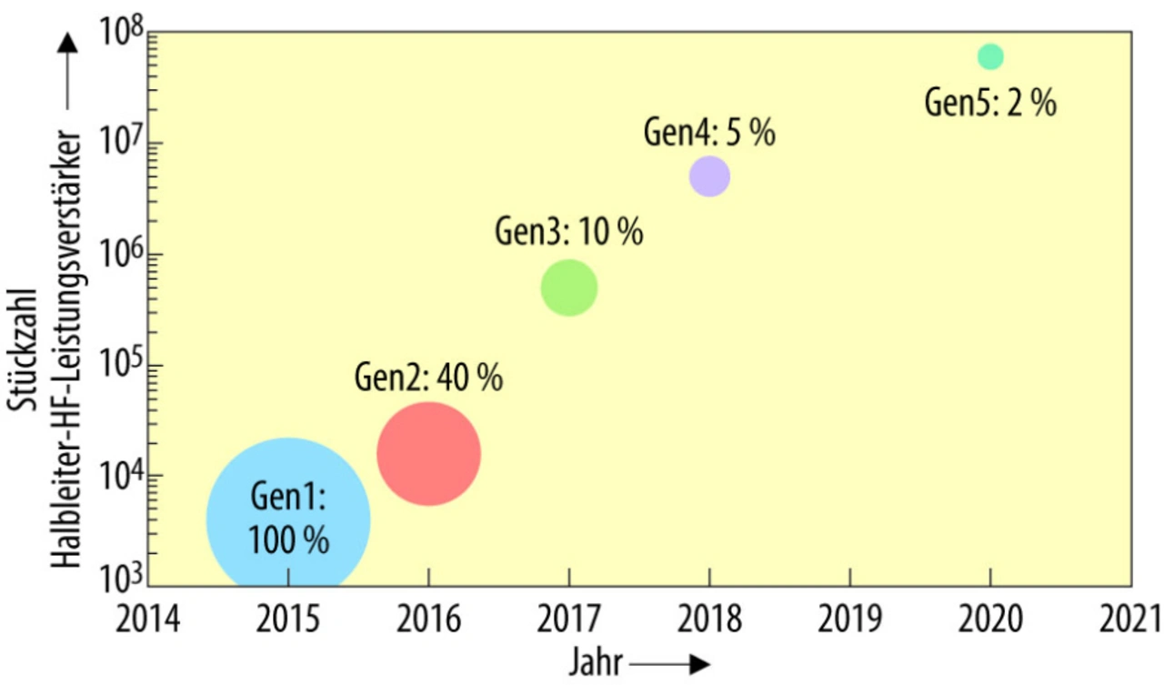Die Hersteller von HF-Leistungshalbleitern erwarten, dass im Laufe der Zeit mit zunehmender Integration und sinkendem Kostenniveau des HF-Leistungsverstärkers die Stückzahl enorm ansteigt (Bild 2).